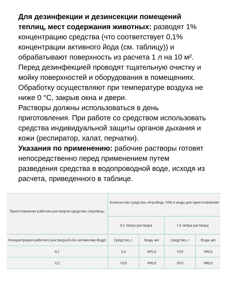 Антисептическое средство «Агройод» предназначено для дезинфекции теплиц, садовых инструментов, помещений (погребов, мест содержания животных), оборудования и транспортных средств. Применение для дезинфекции теплиц: для дезинфекции тепличных конструкций, пленки, стекол против накопившейся за сезон инфекции 100 мл препарата растворяют в 10 литрах воды и равномерно распыляют или наносят губкой по поверхности. На 10 м² поверхности требуется 1–3 литра готового раствора. Если присутствует органическое загрязнение (пыль, жир, налет) перед применением Агройода следует обработать поверхность моющим средством. Применение для дезинфекции в течение сезона: «Агройод» высокоэффективен против распространения вирусных и бактериальных инфекций, поэтому в течение сезона, при уходе за растениями после обрезки, прищипки, пасынковании промывайте инструменты (секаторы, прививочные ножи) от следов клеточного сока в растворе Агройода. Рассадные кассеты, ящики, горшки, которые подлежат повторному использованию также необходимо дезинфицировать. Дезинфекция складских помещений и хранилищ: перед закладкой овощей и фруктов на хранение проводят влажную дезинфекцию стен, перекрытий и прочих конструкций для предотвращения заражения урожая накопившейся в помещении инфекцией (10 мл препарата на 10 литров воды и далее как для дезинфекции теплиц). Двери, окна и вентиляционные люки должны быть закрыты. Температура воздуха должна быть не ниже 0 °С. Для дезинфекции и дезинсекции помещений теплиц, мест содержания животных: разводят 1% концентрацию средства (что соответствует 0,1% концентрации активного йода (см. таблицу)) и обрабатывают поверхность из расчета 1 л на 10 м². Перед дезинфекцией проводят тщательную очистку и мойку поверхностей и оборудования в помещениях. Обработку осуществляют при температуре воздуха не ниже 0 °С, закрыв окна и двери. Растворы должны использоваться в день приготовления.