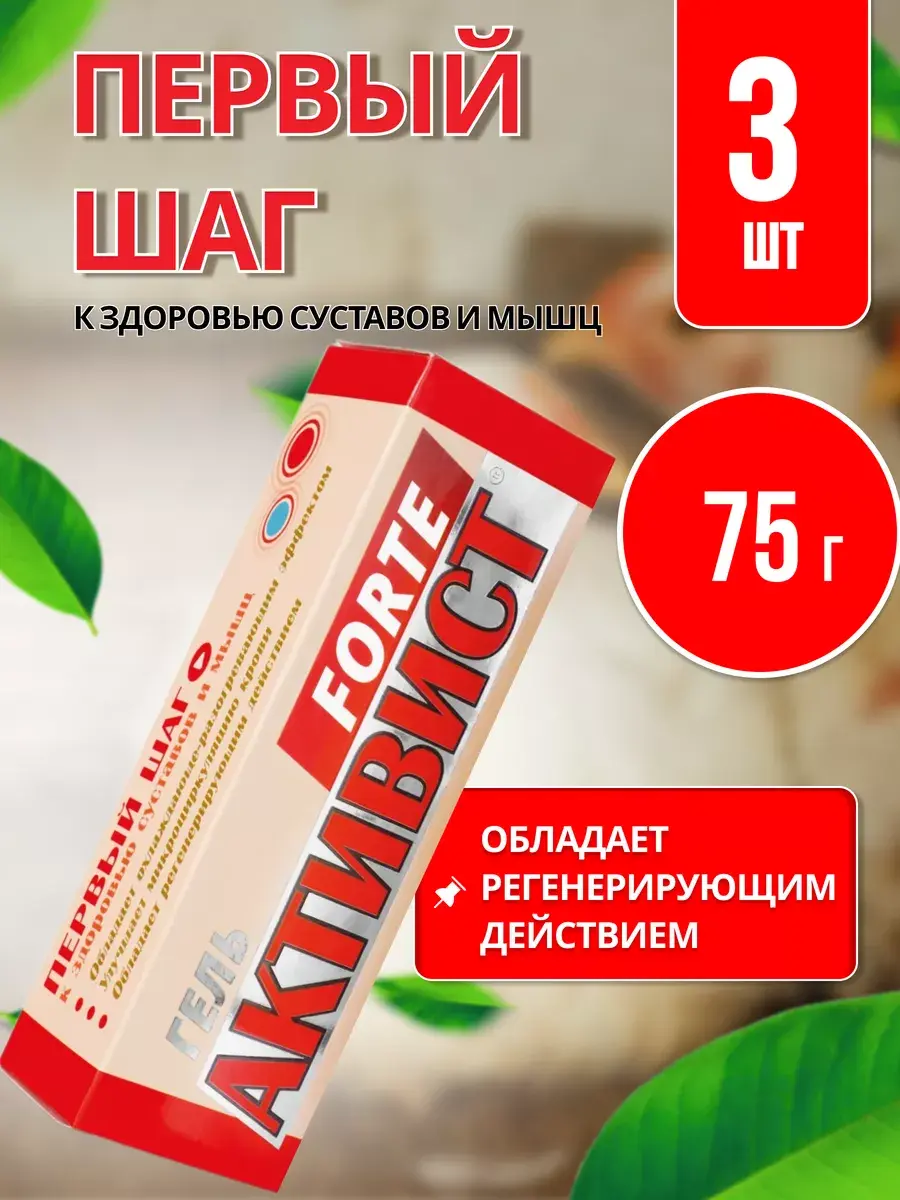 Гель мазь крем Активист, для ухода за кожей в области суставов. Обладает охлаждающей разогревающим эффектом. Снимает напряжение и усталость мышц. Улучшает микроциркуляцию крови. Оказывает противовоспалительное действие. Ускоряет рассасывание гематом и отёков. Улучшает эластичность стенок сосудов. Сразу после нанесения начинается охлаждающее действие благодаря эфирному маслу эвкалипта и ментолу. Компоненты глубоко проникают в ткани, активизируют защитные силы организма, обладают болеутоляющим, противовоспалительным действием. Затем начинается согревающее и расслабляющее действие благодаря уникальному фитокомплексу. **Состав:** фитокомплекс, содержащий экстракты конского каштана, полыни, пихты, перца красного; эфирное масло эвкалипта; эфирное масло мяты; камфора; ментол; глицерин; скипидар; карбопол; триэтаноламин; роконсал; вода очищенная. Гель наносят на чистую, сухую кожу и втирают легкими массажными движениями. Гель можно не смывать.