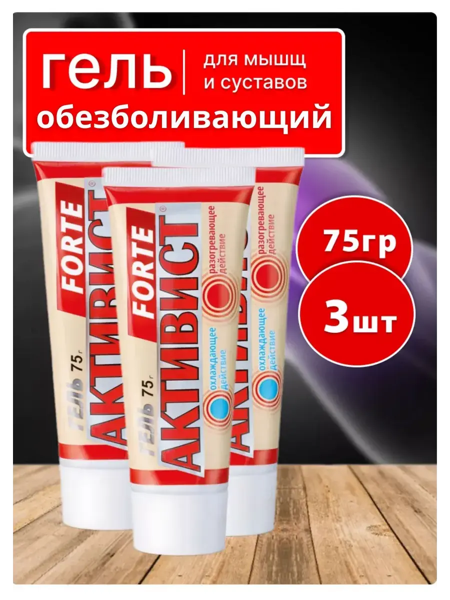 Гель мазь крем Активист, для ухода за кожей в области суставов. Обладает охлаждающей разогревающим эффектом. Снимает напряжение и усталость мышц. Улучшает микроциркуляцию крови. Оказывает противовоспалительное действие. Ускоряет рассасывание гематом и отёков. Улучшает эластичность стенок сосудов. Сразу после нанесения начинается охлаждающее действие благодаря эфирному маслу эвкалипта и ментолу. Компоненты глубоко проникают в ткани, активизируют защитные силы организма, обладают болеутоляющим, противовоспалительным действием. Затем начинается согревающее и расслабляющее действие благодаря уникальному фитокомплексу. **Состав:** фитокомплекс, содержащий экстракты конского каштана, полыни, пихты, перца красного; эфирное масло эвкалипта; эфирное масло мяты; камфора; ментол; глицерин; скипидар; карбопол; триэтаноламин; роконсал; вода очищенная. Гель наносят на чистую, сухую кожу и втирают легкими массажными движениями. Гель можно не смывать.