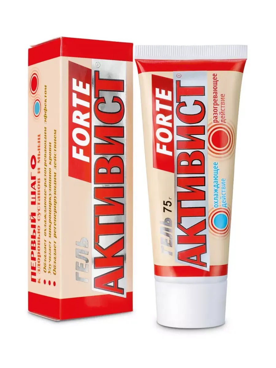 Гель мазь крем Активист, для ухода за кожей в области суставов. Обладает охлаждающей разогревающим эффектом. Снимает напряжение и усталость мышц. Улучшает микроциркуляцию крови. Оказывает противовоспалительное действие. Ускоряет рассасывание гематом и отёков. Улучшает эластичность стенок сосудов. Сразу после нанесения начинается охлаждающее действие благодаря эфирному маслу эвкалипта и ментолу. Компоненты глубоко проникают в ткани, активизируют защитные силы организма, обладают болеутоляющим, противовоспалительным действием. Затем начинается согревающее и расслабляющее действие благодаря уникальному фитокомплексу. **Состав:** фитокомплекс, содержащий экстракты конского каштана, полыни, пихты, перца красного; эфирное масло эвкалипта; эфирное масло мяты; камфора; ментол; глицерин; скипидар; карбопол; триэтаноламин; роконсал; вода очищенная. Гель наносят на чистую, сухую кожу и втирают легкими массажными движениями. Гель можно не смывать.