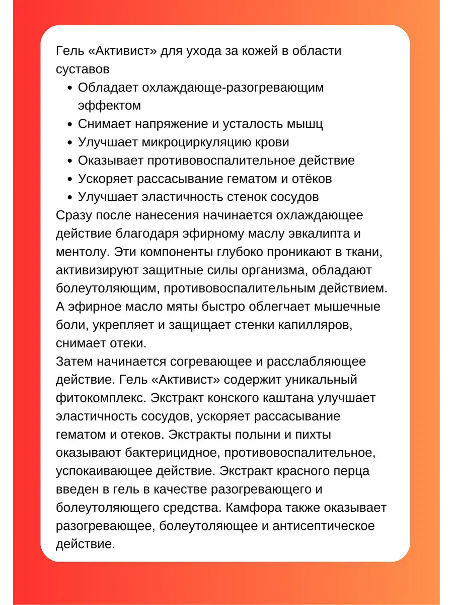 Гель "Активист" для ухода за кожей в области суставов. Сразу после нанесения начинается охлаждающее действие благодаря эфирному маслу эвкалипта и ментолу. Эти компоненты глубоко проникают в ткани, активизируют защитные силы организма, обладают болеутоляющим, противовоспалительным действием. А эфирное масло мяты быстро облегчает мышечные боли, укрепляет и защищает стенки капилляров, снимает отеки. Затем начинается согревающее и расслабляющее действие. Гель Активист содержит уникальный фитокомплекс. Экстракт конского каштана улучшает эластичность сосудов, ускоряет рассасывание гематом и отеков. Экстракты полыни и пихты оказывают бактерицидное, противовоспалительное, успокаивающее действие. Экстракт красного перца введен в гель в качестве разогревающего и болеутоляющего средства. Камфора также оказывает разогревающее, болеутоляющее и антисептическое действие.