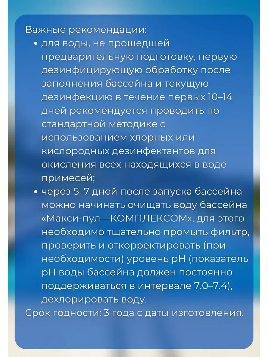 Препарат «Макси-пул—КОМПЛЕКС» несовместим с хлором, активным кислородом и другими окислителями!