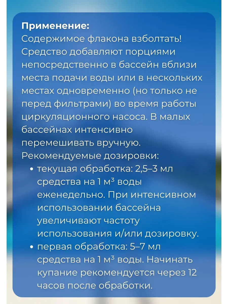 Препарат эффективно очищает воду, способствует устранению ее помутнения. При этом эффективность осветления практически не зависит от уровня рН. Препарат рН-нейтрален; не содержит хлора и тяжелых металлов; непенящийся — пригоден для любого типа бассейнов (в том числе SPA).
