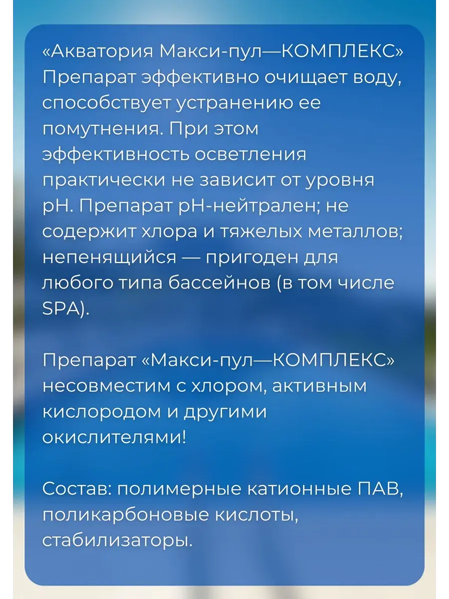 Препарат «Макси-пул—КОМПЛЕКС» несовместим с хлором, активным кислородом и другими окислителями!