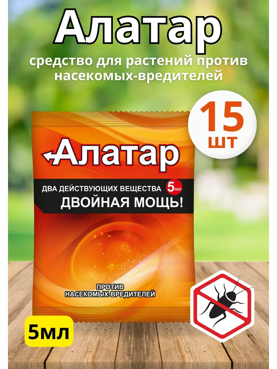 Алатар наносит по вредителям двойной удар, так как содержит сразу два действующих вещества: малатион и циперметрин. Он успешно подавляет даже устойчивые популяции вредителей и обладает синергическим эффектом. Входящий в его состав прилипатель препятствует скатыванию раствора с листьев и смыванию дождем, удлиняет период защитного действия. Препарат имеет малую норму расхода — всего 5 мл/10 л воды на 1 сотку.«Алатар». Это универсальный препарат, он эффективен против множества вредителей плодожорок белянок совок листоверток тлей колорадского жука медяницы трипсов белокрылок, долгоносиков, клещей и т.д. . «Алатар» защитит от вредителей большинство садовых и огородных культур на Вашем участке капусту огурц, томаты яблоню смородину, малину, цветы и т.д.) «Алатар» наносит по вредителям двойной удар, так как содержит сразу два действующих вещества: малатион и циперметрин. Он успешно подавляет даже устойчивые популяции вредителей и обладает синергическим эффектом. Входящий в его состав прилипатель препятствует скатыванию раствора с листьев и смыванию дождем, удлиняет период защитного действия. Препарат имеет малую норму расхода — всего 5 мл/10 л воды на 1 сотку. В вашей садовой аптечке «Алатар» должен быть обязательно как первейшее средство неотложной помощи при неожиданном нападении вредителей.Алатар для борьбы с насекомыми применяется весь сезон активного роста культур. Препарат широкого спектра действия справляется с 60 видами вредителей сада и огорода. Быстрый результат наступает благодаря действию сразу двух активных компонентов. Остаточный эффект сохраняется 20 дней. Препарат устойчив к влаге, ультрафиолетовым лучам. Уничтожает имаго, нимф и личинок разного возраста.