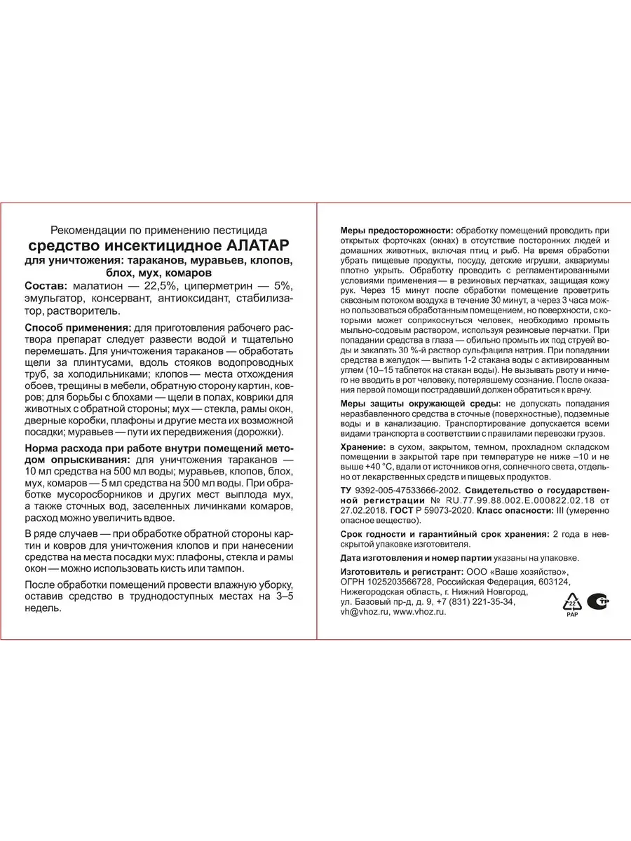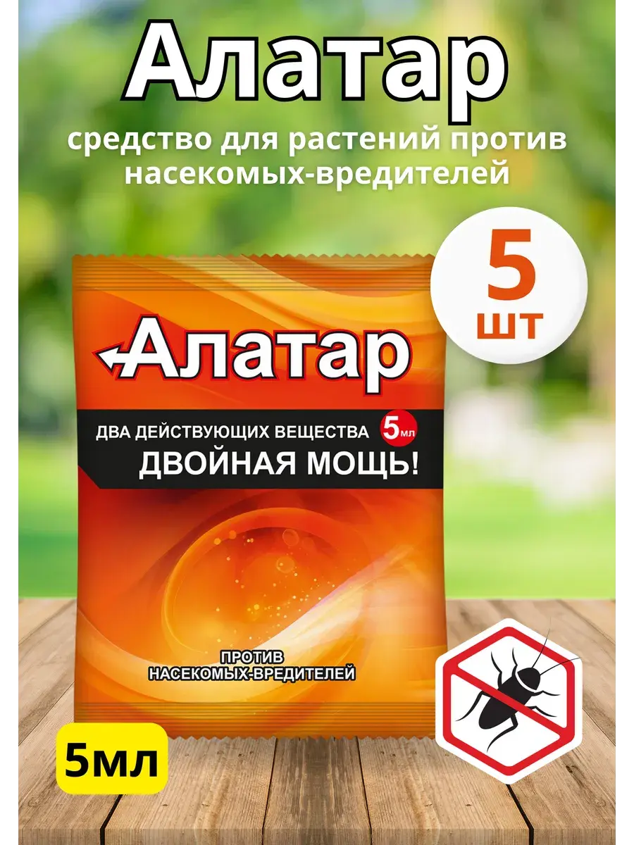 Алатар наносит по вредителям двойной удар, так как содержит сразу два действующих вещества: малатион и циперметрин. Он успешно подавляет даже устойчивые популяции вредителей и обладает синергическим эффектом. Входящий в его состав прилипатель препятствует скатыванию раствора с листьев и смыванию дождем, удлиняет период защитного действия. Препарат имеет малую норму расхода — всего 5 мл/10 л воды на 1 сотку.«Алатар». Это универсальный препарат, он эффективен против множества вредителей плодожорок белянок совок листоверток тлей колорадского жука медяницы трипсов белокрылок, долгоносиков, клещей и т.д. . «Алатар» защитит от вредителей большинство садовых и огородных культур на Вашем участке капусту огурц, томаты яблоню смородину, малину, цветы и т.д.) «Алатар» наносит по вредителям двойной удар, так как содержит сразу два действующих вещества: малатион и циперметрин. Он успешно подавляет даже устойчивые популяции вредителей и обладает синергическим эффектом. Входящий в его состав прилипатель препятствует скатыванию раствора с листьев и смыванию дождем, удлиняет период защитного действия. Препарат имеет малую норму расхода — всего 5 мл/10 л воды на 1 сотку. В вашей садовой аптечке «Алатар» должен быть обязательно как первейшее средство неотложной помощи при неожиданном нападении вредителей.Алатар для борьбы с насекомыми применяется весь сезон активного роста культур. Препарат широкого спектра действия справляется с 60 видами вредителей сада и огорода. Быстрый результат наступает благодаря действию сразу двух активных компонентов. Остаточный эффект сохраняется 20 дней. Препарат устойчив к влаге, ультрафиолетовым лучам. Уничтожает имаго, нимф и личинок разного возраста.