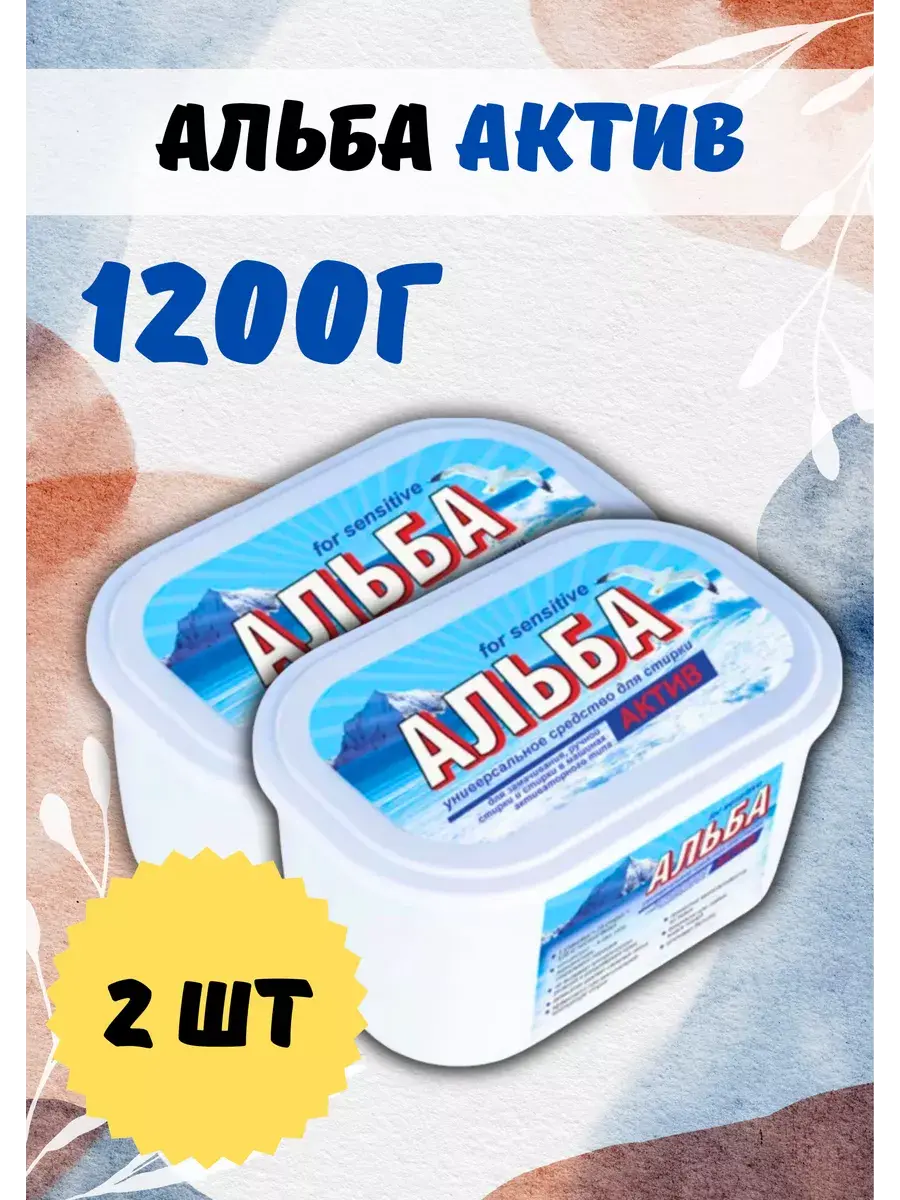 Средство для стирки Альба актив контейнер 1200г. Средство для стирки «Альба Актив» - это инновационное средство, которое обеспечивает высокую эффективность удаления пятен, свежесть и приятный аромат вашего белья. Обладает следующими преимуществами: подходит для замачивания, ручной стирки и стирки в машинах активаторного типа. Концентрат — в два раза экономичнее стирального порошка, 1 упаковка (1200 г.) = 24 стирки = 120 кг чистого белья. Не вызывает аллергических реакций (порошок гипоаллергенный) и раздражения кожи, безопасно для окружающей среды. Оно не содержит фосфатов и других вредных химических веществ, что делает его экологически чистым и безопасным для использования. Деликатно удаляет сложные пятна (кофе; вино, грязь и жир), проникая глубоко в волокна ткани, разлагая пятна и удаляя их даже при низких температурах стирки. Полностью выполаскивается из ткани, предотвращает выцветание и потерю яркости цветов, сохраняя ваше белье свежим и новым даже после многократных стирок; безопасно для любых видов тканей, усиливает белизну.