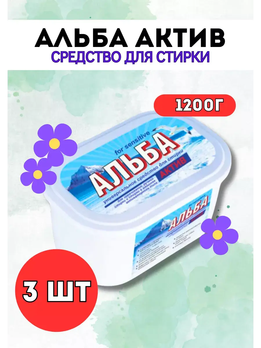 Средство для стирки Альба Актив контейнер 1200г. Средство для стирки «Альба Актив» - это инновационное средство, которое обеспечивает высокую эффективность удаления пятен, свежесть и приятный аромат вашего белья. Обладает следующими преимуществами: подходит для замачивания, ручной стирки и стирки в машинах активаторного типа. Концентрат — в два раза экономичнее стирального порошка, 1 упаковка (1200 г.) = 24 стирки = 120 кг чистого белья. Не вызывает аллергических реакций (порошок гипоаллергенный) и раздражения кожи, безопасно для окружающей среды. Оно не содержит фосфатов и других вредных химических веществ, что делает его экологически чистым и безопасным для использования. Деликатно удаляет сложные пятна (кофе; вино, грязь и жир), проникая глубоко в волокна ткани, разлагая пятна и удаляя их даже при низких температурах стирки. Полностью выполаскивается из ткани, предотвращает выцветание и потерю яркости цветов, сохраняя ваше белье свежим и новым даже после многократных стирок; безопасно для любых видов тканей, усиливает белизну.