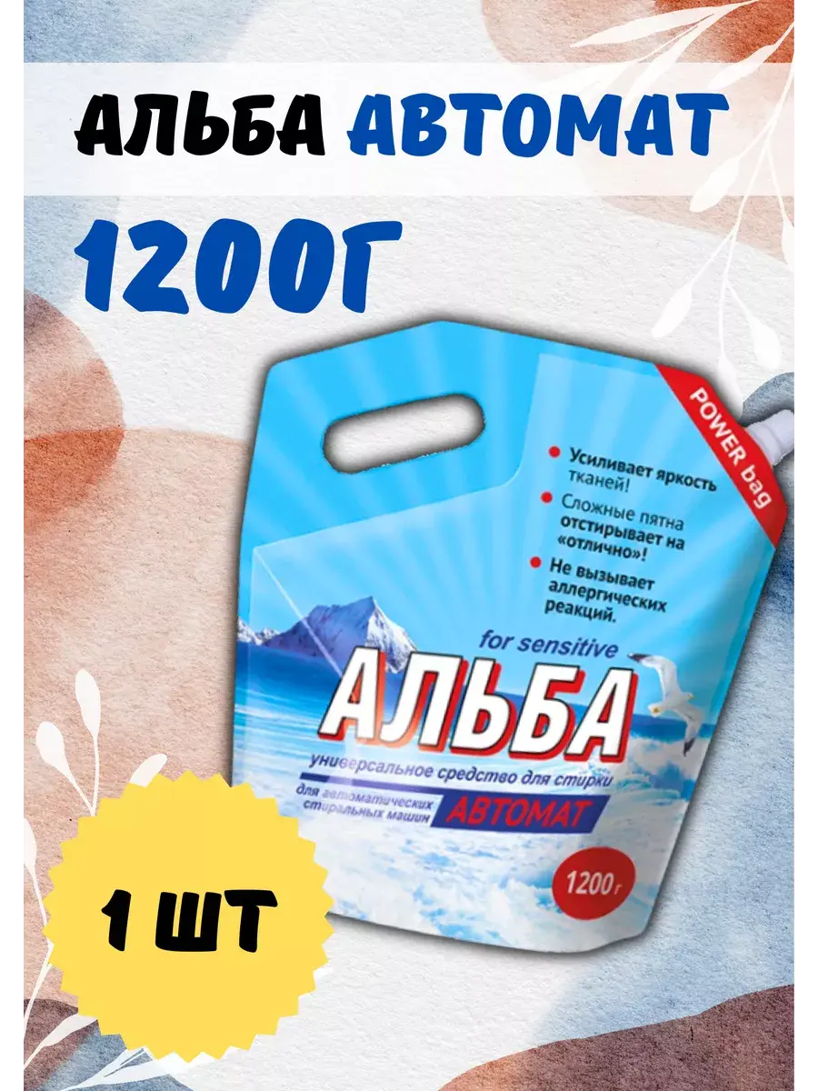 Альба Автомат for sensitive гель - Средство для стирки Альба автомат 1200г. для автоматических стиральных машин. Концентрат — в два раза экономичнее стирального порошка. Гель для стирки Альба автомат не вызывает аллергических реакций и раздражения кожи. Деликатно удаляет сложные пятна. Эффективно при минимальной температуре стирки. Альба для стирки автомат полностью выполаскивается из ткани. Концентрированный стиральный порошок безопасен для любых видов тканей. Усиливает белизну. Рекомендации при использовании: изделия из хлопчатобумажных и льняных тканей рекомендуется предварительно замачивать. Цветное белье замачивать и стирать отдельно. Для сильно загрязненного белья расход средства увеличить. Следовать рекомендациям на ярлыках изделий. Применение и дозировка: для стирки использовать шар-контейнер., который приобретается отдельно. Открутить верхнюю часть шара от нижней. Через носик пакета извлечь пасту в количестве 50 мл, наполнить ею нижнюю часть контейнера. Для удобства использования на внутренней поверхности шара— линия, соответствующие 50 мл средства. Закрутить верхнюю крышку контейнера и поместить его вместе с бельём в барабан стиральной машины. Замачивание белья: 25г (1 столовую ложку) на 4-5 литров теплой воды (35-45С). Время замачивания 2-3 часа. Ручная стирка: 25 г (1 столовую ложку) пасты растворить в 4-5 литрах теплой воды 35-45С. Машинная стирка: 50 грамм (2 столовые ложки) пасты на 4-5 кг белья заложить шар в барабан с бельем. При крайне сильном загрязнении нанести пасту на места загрязнения.Концентрированный порошок стиральный автомат для стирки предназначен для цветного белья и белого белья. Стиральный порошок автомат применим для одежды, постельного белья, хлопка и полотенец. Не вызывает аллергических реакций, может использоваться как порошок детский гипоаллергенный.
