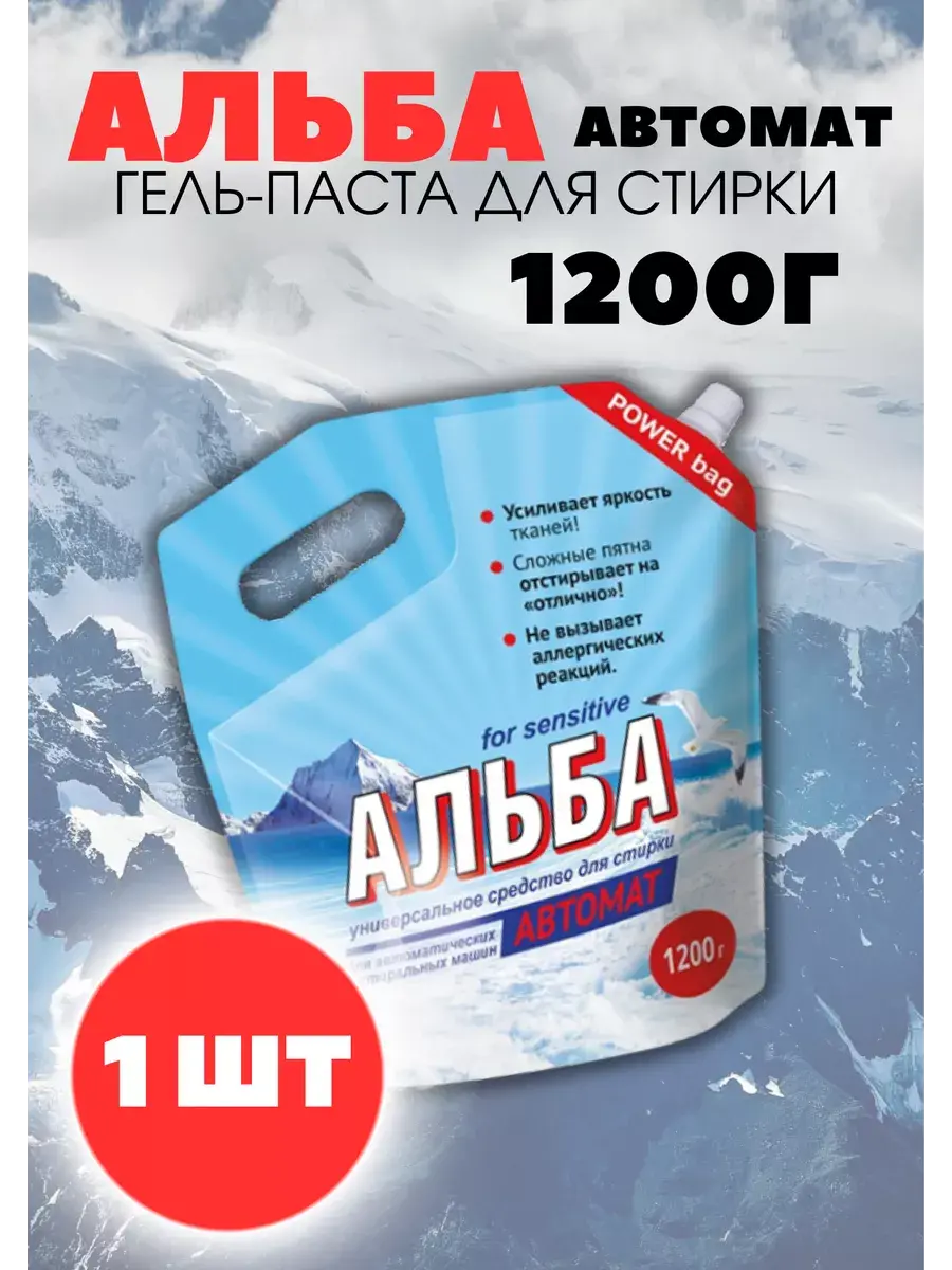 Альба Автомат for sensitive гель - Средство для стирки Альба автомат 1200г. для автоматических стиральных машин. Концентрат — в два раза экономичнее стирального порошка. Гель для стирки Альба автомат не вызывает аллергических реакций и раздражения кожи. Деликатно удаляет сложные пятна. Эффективно при минимальной температуре стирки. Альба для стирки автомат полностью выполаскивается из ткани. Концентрированный стиральный порошок безопасен для любых видов тканей. Усиливает белизну. Рекомендации при использовании: изделия из хлопчатобумажных и льняных тканей рекомендуется предварительно замачивать. Цветное белье замачивать и стирать отдельно. Для сильно загрязненного белья расход средства увеличить. Следовать рекомендациям на ярлыках изделий. Применение и дозировка: для стирки использовать шар-контейнер., который приобретается отдельно. Открутить верхнюю часть шара от нижней. Через носик пакета извлечь пасту в количестве 50 мл, наполнить ею нижнюю часть контейнера. Для удобства использования на внутренней поверхности шара— линия, соответствующие 50 мл средства. Закрутить верхнюю крышку контейнера и поместить его вместе с бельём в барабан стиральной машины. Замачивание белья: 25г (1 столовую ложку) на 4-5 литров теплой воды (35-45С). Время замачивания 2-3 часа. Ручная стирка: 25 г (1 столовую ложку) пасты растворить в 4-5 литрах теплой воды 35-45С. Машинная стирка: 50 грамм (2 столовые ложки) пасты на 4-5 кг белья заложить шар в барабан с бельем. При крайне сильном загрязнении нанести пасту на места загрязнения.Концентрированный порошок стиральный автомат для стирки предназначен для цветного белья и белого белья. Стиральный порошок автомат применим для одежды, постельного белья, хлопка и полотенец. Не вызывает аллергических реакций, может использоваться как порошок детский гипоаллергенный.