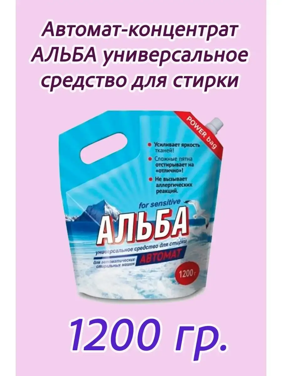Альба Автомат for sensitive гель - Средство для стирки Альба автомат 1200г. для автоматических стиральных машин. Концентрат — в два раза экономичнее стирального порошка. Гель для стирки Альба автомат не вызывает аллергических реакций и раздражения кожи. Деликатно удаляет сложные пятна. Эффективно при минимальной температуре стирки. Альба для стирки автомат полностью выполаскивается из ткани. Концентрированный стиральный порошок безопасен для любых видов тканей. Усиливает белизну. Рекомендации при использовании: изделия из хлопчатобумажных и льняных тканей рекомендуется предварительно замачивать. Цветное белье замачивать и стирать отдельно. Для сильно загрязненного белья расход средства увеличить. Следовать рекомендациям на ярлыках изделий. Применение и дозировка: для стирки использовать шар-контейнер., который приобретается отдельно. Открутить верхнюю часть шара от нижней. Через носик пакета извлечь пасту в количестве 50 мл, наполнить ею нижнюю часть контейнера. Для удобства использования на внутренней поверхности шара— линия, соответствующие 50 мл средства. Закрутить верхнюю крышку контейнера и поместить его вместе с бельём в барабан стиральной машины. Замачивание белья: 25г (1 столовую ложку) на 4-5 литров теплой воды (35-45С). Время замачивания 2-3 часа. Ручная стирка: 25 г (1 столовую ложку) пасты растворить в 4-5 литрах теплой воды 35-45С. Машинная стирка: 50 грамм (2 столовые ложки) пасты на 4-5 кг белья заложить шар в барабан с бельем. При крайне сильном загрязнении нанести пасту на места загрязнения.Концентрированный порошок стиральный автомат для стирки предназначен для цветного белья и белого белья. Стиральный порошок автомат применим для одежды, постельного белья, хлопка и полотенец. Не вызывает аллергических реакций, может использоваться как порошок детский гипоаллергенный.