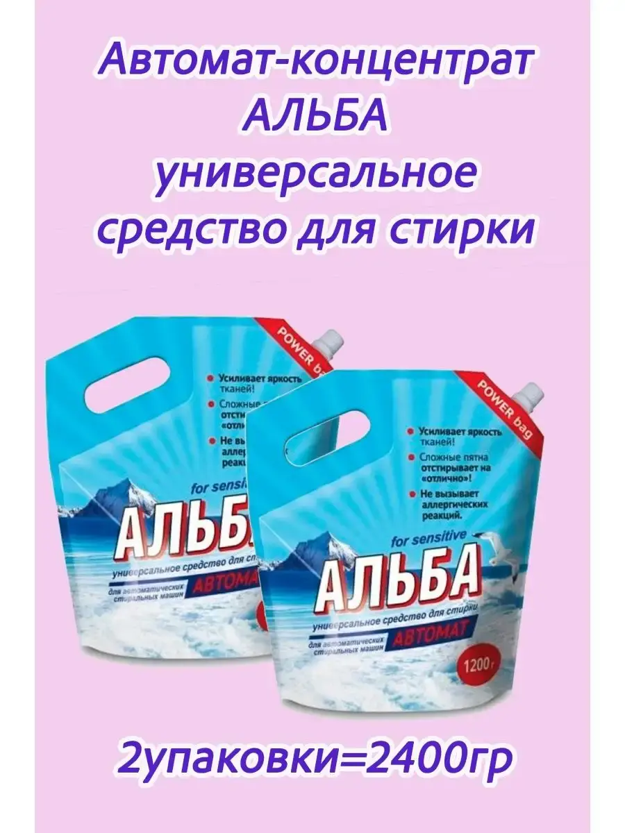Альба Автомат for sensitive гель - Средство для стирки Альба автомат 1200г. для автоматических стиральных машин. Концентрат — в два раза экономичнее стирального порошка. Гель для стирки Альба автомат не вызывает аллергических реакций и раздражения кожи. Деликатно удаляет сложные пятна. Эффективно при минимальной температуре стирки. Альба для стирки автомат полностью выполаскивается из ткани. Концентрированный стиральный порошок безопасен для любых видов тканей. Усиливает белизну. Рекомендации при использовании: изделия из хлопчатобумажных и льняных тканей рекомендуется предварительно замачивать. Цветное белье замачивать и стирать отдельно. Для сильно загрязненного белья расход средства увеличить. Следовать рекомендациям на ярлыках изделий. Применение и дозировка: для стирки использовать шар-контейнер., который приобретается отдельно. Открутить верхнюю часть шара от нижней. Через носик пакета извлечь пасту в количестве 50 мл, наполнить ею нижнюю часть контейнера. Для удобства использования на внутренней поверхности шара— линия, соответствующие 50 мл средства. Закрутить верхнюю крышку контейнера и поместить его вместе с бельём в барабан стиральной машины. Замачивание белья: 25г (1 столовую ложку) на 4-5 литров теплой воды (35-45С). Время замачивания 2-3 часа. Ручная стирка: 25 г (1 столовую ложку) пасты растворить в 4-5 литрах теплой воды 35-45С. Машинная стирка: 50 грамм (2 столовые ложки) пасты на 4-5 кг белья заложить шар в барабан с бельем. При крайне сильном загрязнении нанести пасту на места загрязнения.Концентрированный порошок стиральный автомат для стирки предназначен для цветного белья и белого белья. Стиральный порошок автомат применим для одежды, постельного белья, хлопка и полотенец. Не вызывает аллергических реакций, может использоваться как порошок детский гипоаллергенный.