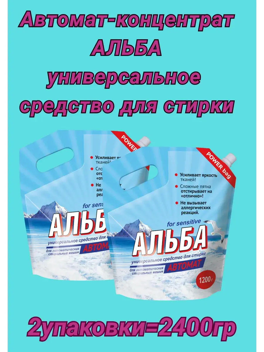 Альба Автомат for sensitive гель - Средство для стирки Альба автомат 1200г. для автоматических стиральных машин. Концентрат — в два раза экономичнее стирального порошка. Гель для стирки Альба автомат не вызывает аллергических реакций и раздражения кожи. Деликатно удаляет сложные пятна. Эффективно при минимальной температуре стирки. Альба для стирки автомат полностью выполаскивается из ткани. Концентрированный стиральный порошок безопасен для любых видов тканей. Усиливает белизну. Рекомендации при использовании: изделия из хлопчатобумажных и льняных тканей рекомендуется предварительно замачивать. Цветное белье замачивать и стирать отдельно. Для сильно загрязненного белья расход средства увеличить. Следовать рекомендациям на ярлыках изделий. Применение и дозировка: для стирки использовать шар-контейнер., который приобретается отдельно. Открутить верхнюю часть шара от нижней. Через носик пакета извлечь пасту в количестве 50 мл, наполнить ею нижнюю часть контейнера. Для удобства использования на внутренней поверхности шара— линия, соответствующие 50 мл средства. Закрутить верхнюю крышку контейнера и поместить его вместе с бельём в барабан стиральной машины. Замачивание белья: 25г (1 столовую ложку) на 4-5 литров теплой воды (35-45С). Время замачивания 2-3 часа. Ручная стирка: 25 г (1 столовую ложку) пасты растворить в 4-5 литрах теплой воды 35-45С. Машинная стирка: 50 грамм (2 столовые ложки) пасты на 4-5 кг белья заложить шар в барабан с бельем. При крайне сильном загрязнении нанести пасту на места загрязнения.Концентрированный порошок стиральный автомат для стирки предназначен для цветного белья и белого белья. Стиральный порошок автомат применим для одежды, постельного белья, хлопка и полотенец. Не вызывает аллергических реакций, может использоваться как порошок детский гипоаллергенный.