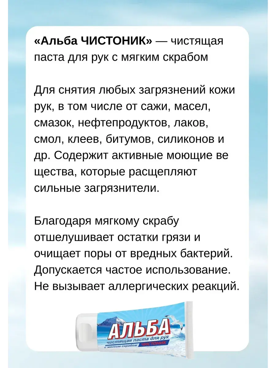 Чистота рук играет важную роль в нашей повседневной гигиене и здоровье. Чтобы обеспечить безупречную чистоту и защиту, необходимо использовать высококачественное средство для очистки рук. Чистящая паста для рук АЛЬБА ЧИСТОНИК туба 150 мл. - это инновационное средство, разработанное специально для эффективной очистки и ухода за кожей рук. Паста для рук обладает следующими преимуществами: паста моющая для чистки рук обогащена увлажняющими компонентами, которые помогают сохранить естественный баланс увлажнения и мягкости кожи.