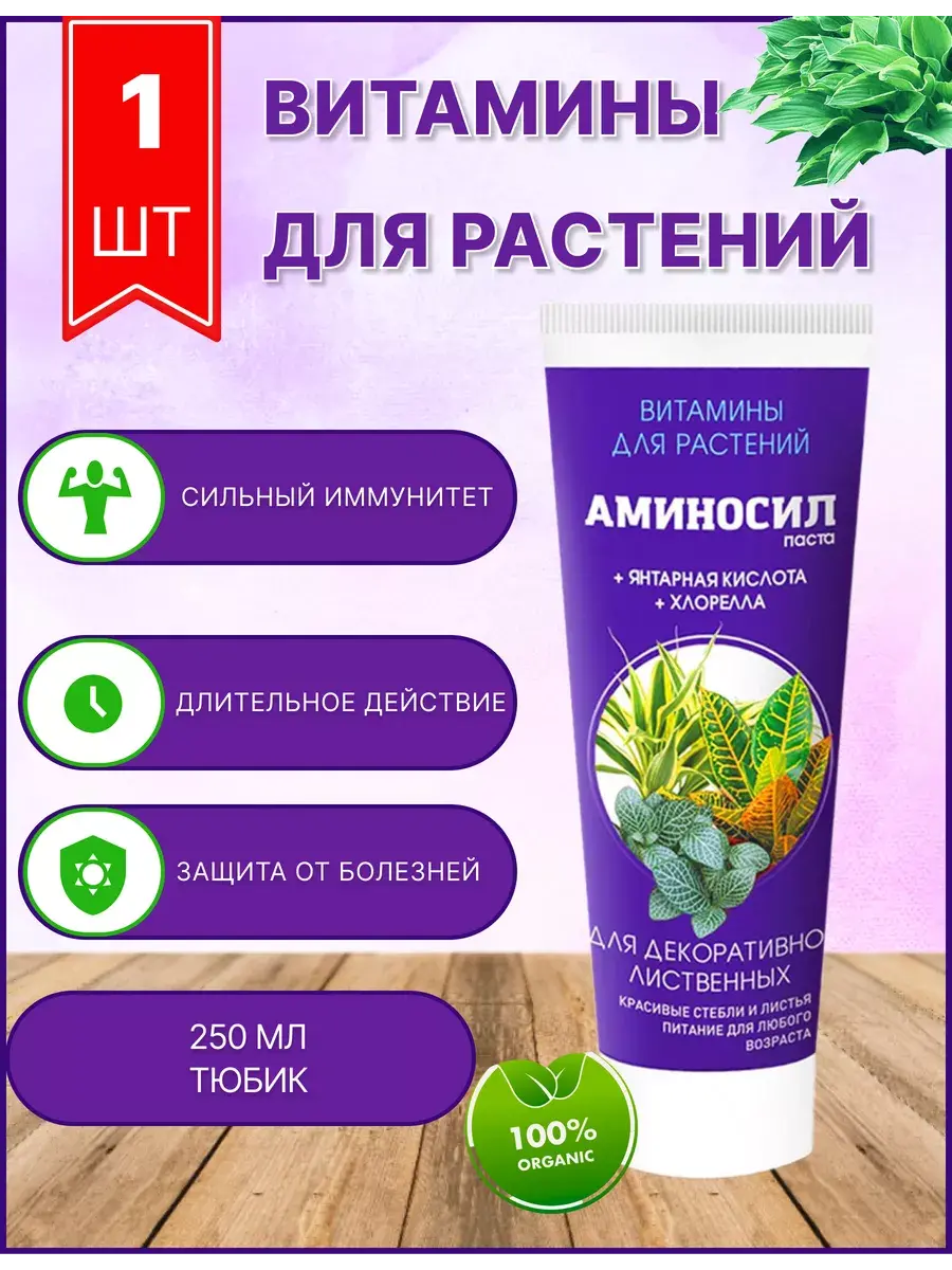 Витамины для декоративно-лиственных растений Аминосил, гель 250 мл, с янтарной кислотой и хлореллой, в хелатной форме укрепляет структуру растения, усиливает естественный иммунитет, улучшает усвояемость удобрений всех видов. Содержит более 40 жизненно важных растению аминокислот. Экстракт зеленой микроводоросли содержит важные клеточные ингредиенты для замиокулькаса, спатифиллума, фикусов и пальм, драцены и бегонии, хлорофитума и диффенбахии, для фикуса бенджамина. Широкий комплекс биологически активных веществ: фитогормоны, ауксины, цитокины, аминокислоты и витамины обеспечивают здоровое развитие. Янтарная кислота активирует основные процессы роста и развития, повышает иммунитет растений, улучшает усвоение питательных веществ, помогает выработке пептидов – регуляторов защиты от токсинов, усиливает стрессоустойчивость, усиливает рост корневой системы, улучшает фотосинтез, улучшает декоративность, обладает нейтральным запахом. Удобрение предназначено для выращивания всех видов декоративно-лиственных растений.Способ применения удобрения: Перед употреблением содержимое тюбика тщательно размять (перемешать). Разведите водой комнатной температуры, не содержащей хлора и других, ядовитых для растения веществ. В период с марта по октябрь каждые 7-14 дней, с ноября по февраль каждые 30 дней.Корневые подкормки. Экстракт 15 мл на 1 л воды. Норма расхода как при обычном поливе. Некорневые подкормки. Экстракт 10 мл на 1л воды. Опрыскивать до полного смачивания листа. К сведению: 1 чайная ложка = 5 мл. 1 столовая ложка = 15мл. Условия хранения: в защищённом от света месте от +1°С до +25°С. Срок хранения: 36 месяцев при температуре от +1°С до +6°С, 24 месяца от +10°С до +25°С, со дня изготовления в невскрытой заводской упаковке. Идеально для комнатных растений, органическая подкормка для декоративно лиственных, фикусов пальм драцены диффенбахия.