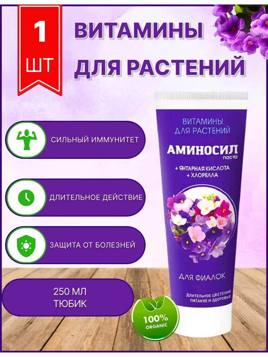Витамины для фиалок Аминосил, паста 250 мл, с янтарной кислотой и хлореллой. Витаминный комплекс АМИНОСИЛ в хелатной форме укрепляет структуру растения, усиливаем естественный иммунитет, улучшает усвояемость удобрений всех видов. Содержит более 40 жизненно важных растению аминокислот. Экстракт зеленой микроводоросли ChlorellaVulgaris содержит важные клеточные ингредиенты. Активирует основные процессы роста и развития, повышает иммунитет растений. Воздействует на метаболизм и улучшает усвоение питательных веществ, помогает выработке пептидов – регуляторов защиты от токсинов. •стимулирует начало цветения•увеличивает продолжительность цветения•укрепляет иммунитет и усиливает стрессоустойчивость• усиливает рост корневой системы•улучшает фотосинтез•улучшает декоративность•усиливает сопротивляемость к болезням•обладает нейтральным запахом. Предназначено для выращивания всех видов фиалок. СПОСОБ ПРИМЕНЕНИЯ:Перед употреблением содержимое тюбика тщательно размять (перемешать). Разведите экстракт водой комнатной температуры, не содержащей хлора и других, ядовитых для растения веществ.В период с марта по октябрь каждые 7-14 дней, с ноября по февраль каждые 30 дней. Корневые подкормки. Экстракт 15 мл на 1 л воды. Норма расхода как при обычном поливе. Некорневые подкормки. Экстракт 10 мл на 1л воды. Опрыскивать до полного смачивания листа.К сведению: 1 чайная ложка = 5 мл.1 столовая ложка = 15мл. Срок хранения: 36 месяцев при температуре от +1°С до +6°С, 24 месяца при температуре от +10°С до +25°С, со дня изготовления в невскрытой заводской упаковке. Вскрытую упаковку хранить при температуре от +1°С до +6°С не более 6-ти месяцев.