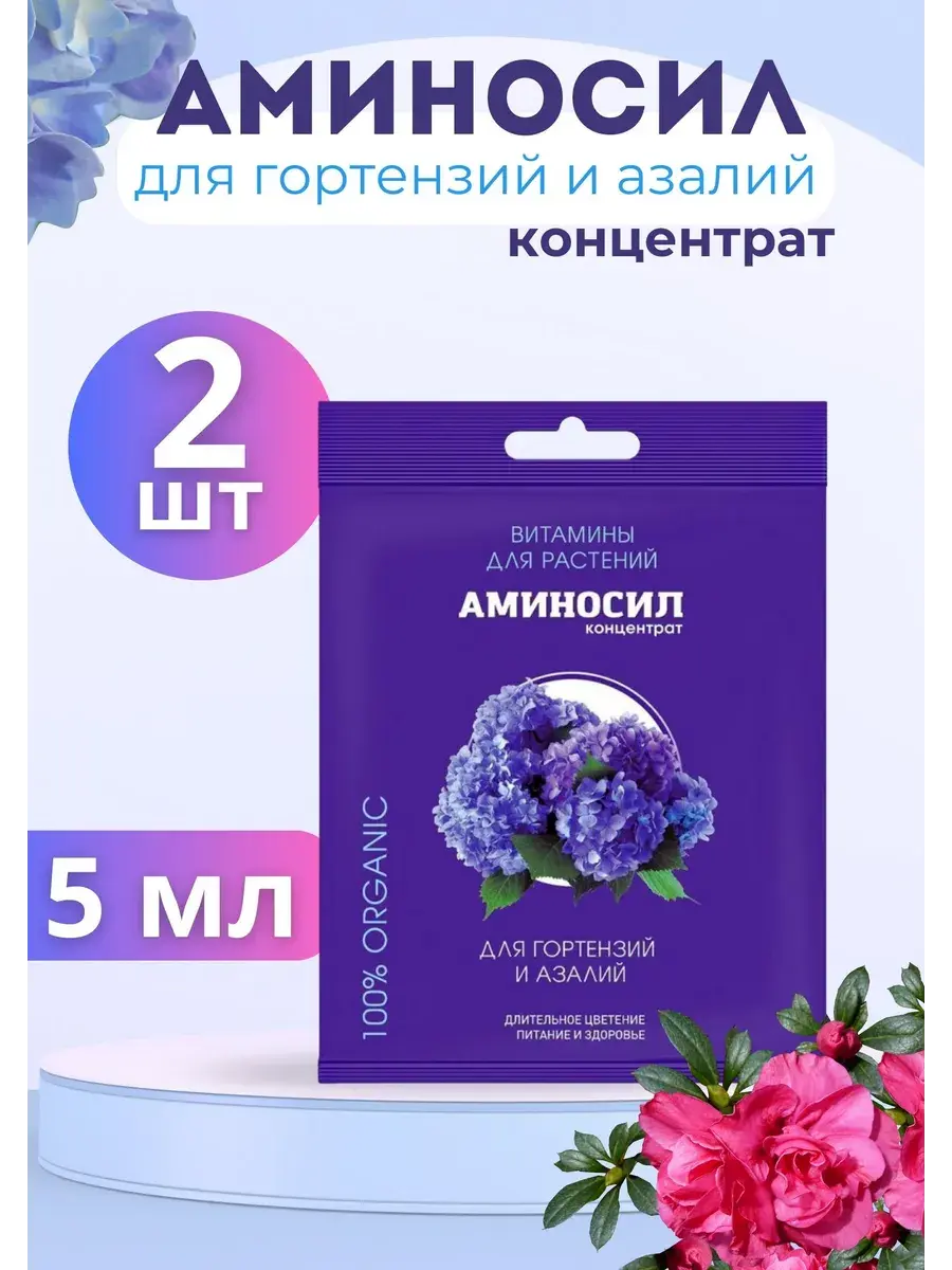 Витамины для гортензий и азалий это удобрение для цветущих кустарников рекомендуется использовать для питания, здорового роста и развития вересковых культур.Идеально подходит для ухода, питания и удобрения: 1. Насыщает растение, субстрат и почву всеми необходимыми витаминами; 2. Укрепляет здоровье и иммунитет растения; 3. Защита от температурный изменений, болезней и недостатка солнечного света.Удобрение для гортензий и азалий - это комплексное жидкое органическое удобрение, разработанное специально для растений вересковых культур, таких как гортензии и азалии, гибискус, рододендроны и другие кустарники. Оно обеспечивает длительное рост и цветения растений благодаря уникальному комплексу натуральных микроэлементов.Это удобрение является водорастворимым и подходит для использования в различных типах грунта. Оно идеально подходит для подкормки кустарников вересковых культур, а также для саженцев и рассады. Весной удобрение помогает гортензиям и азалиям быстро восстановить активный рост на солнечной даче. Оно обеспечивает растения необходимыми питательными веществами, которые поддерживают здоровье растений, стимулируют цветение и развивают крепкие корни.Летом удобрение позволяет растениям сохранять свою красоту в период наиболее интенсивного цветения. Оно стимулирует длительное цветение растений и обеспечивает дополнительную защиту от стресса.ИНСТРУКЦИЯ: Расход: 5 мл разбавить в 2 л воды до образования однородного раствора. Вариант 1: поливать почву и растение раствором ближе к корневой системе из расчета 1 л на 1 м2. Вариант 2: опрыскивать растение раствором до полного смачивания листвы. Избегать попадания на бутоны и лепестки цветов. Периодичность: Для комнатных цветов: 1 раз в 2 недели (с мая по октябрь) и 1 раз в 4 недели (с ноября по апрель). Для садовых цветов: 1 раз в две недели (с апреля по август).Регулярное использование АМИНОСИЛ надолго обеспечит обильное цветение и здоровье ваших гортензий.