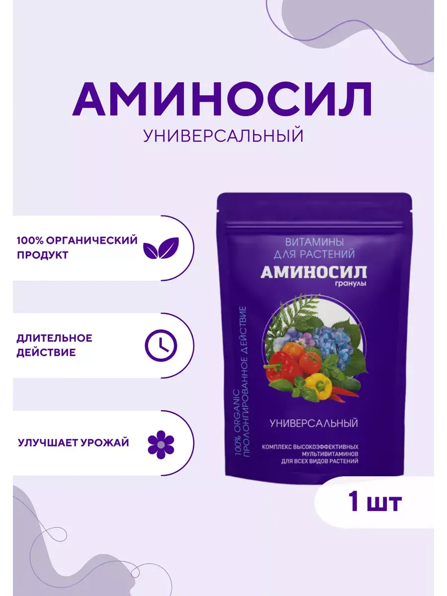 Витамины Аминосил в форме гранул – пролонгированное комплексное питание растений. Регулярное применение универсального удобрения гарантирует повышение иммунитета растений и стабильное развитие на всех этапах жизни. Аминосил универсальный в гранулах подходит для всех видов растений – комнатных и садовых, тепличных и оранжерейных. Гранулированная подкормка имеет 100% органический состав. Улучшает обмен веществ за счет высокого содержания аминокислот. Способствует росту и развитию корневой системы, усиливает вегетацию. Обеспечивает длительное и обильное цветение. Увеличивают урожайность и качество плодов. ПРИМЕНЕНИЕ и дозировка индивидуально разработана для каждого вида растений и указана на упаковке препарата в подробной инструкции. Хранить при температуре от -35 до +25 градусов. Срок годности неограничен. Допускается наличие специфического запаха.