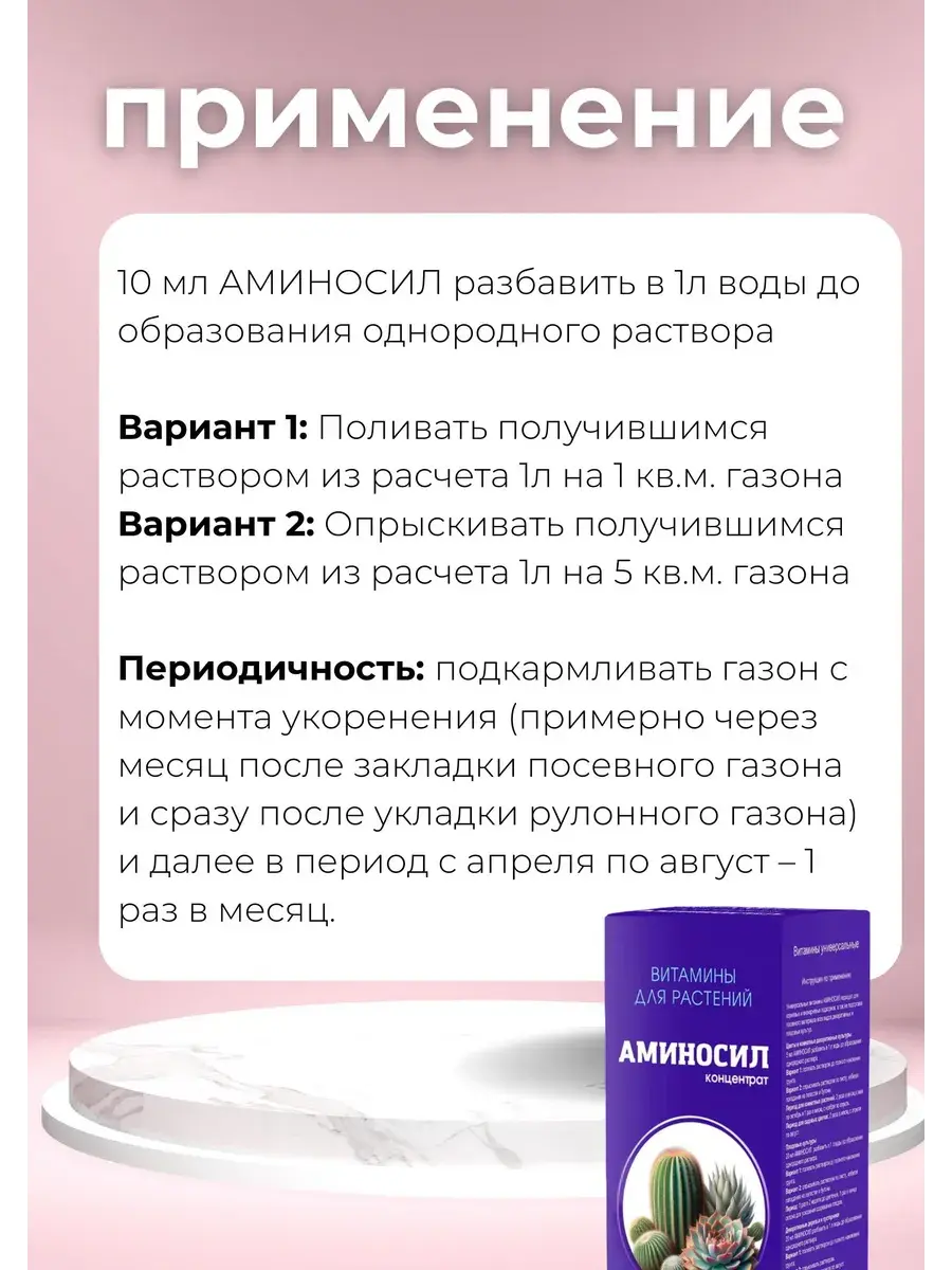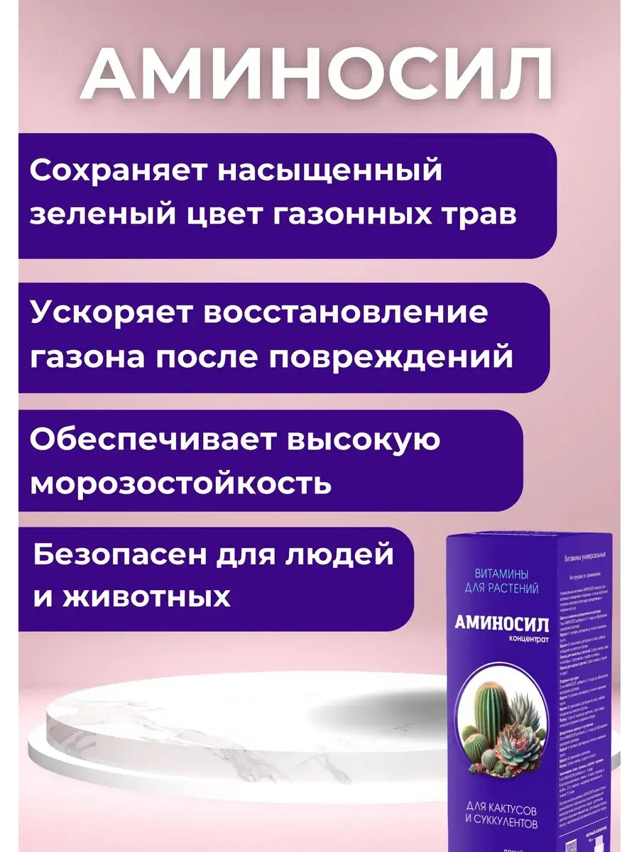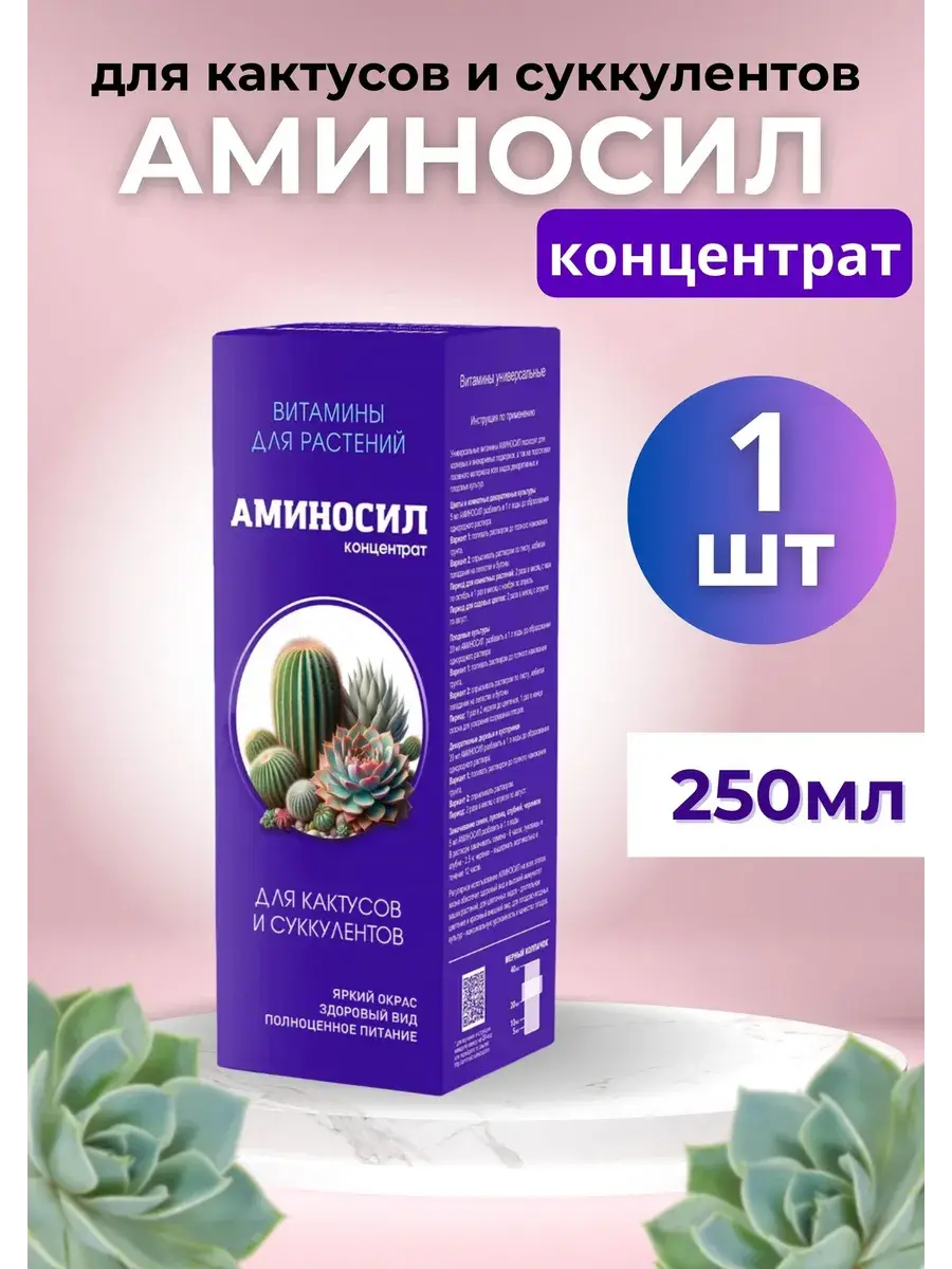 Витамины Аминосил для кактусов и суккулентов в форме концентрата. Регулярное использование Аминосил обеспечит адаптированное эффективное питание вашей коллекции кактусов и суккулентов, включая алоэ, агавы, гастерии, каланхоэ, молочай, монантесу, толстянки, шлюмбергеры и пр. Легкое усвоение витаминов и формирование крепкого иммунитета сделает растения устойчивыми к болезням, вредителям и неблагоприятным условиям среды. Усилит цветение и подарит цветам яркую окраску.Эффективно насыщает растения всеми необходимыми элементами питания.Способствует нарастанию зеленой массы и яркому цветению.Уменьшает риск заболеваний и увеличивает скорость восстановления растений.Укрепляет корневую систему и защищает ее от загнивания.Инструкция: Расход 5мл Аминосил разбавить в 1 л воды. Поливать почву получившимся раствором до полного намокания грунта/субстрата. Не допускается опрыскивание или полив растения сверху! Периодичность: 1 раз в 2 недели с марта по октябрь, 1 раз в 4 недели с ноября по февраль.