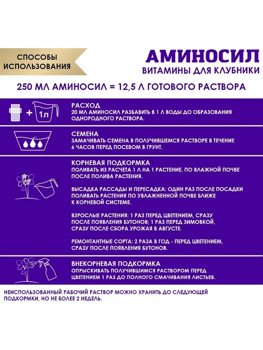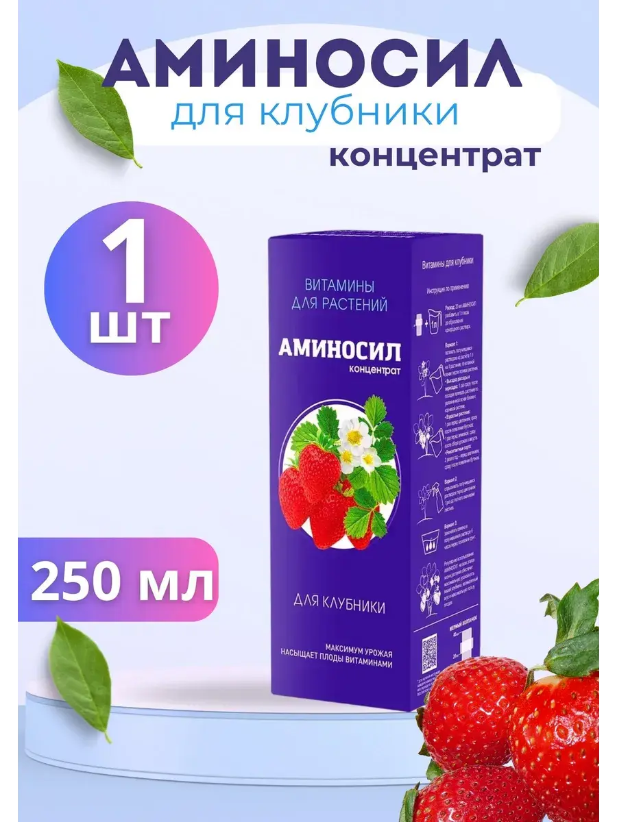 Витамины для клубники Аминосил идеально подходят для всесезонной подкормки, летом для ухода, питания и удобрения клубники (садовой земляники) всех сортов. Органические витамины - одно из обязательных условий для урожая и здоровья клубники. Обеспечивает больше цветов и ягод. Ягоды крупнее, сочнее и слаще. Укрепляет иммунитет и защищает от болезней. Улучшает защитные свойства в периоды засухи и заморозков. Вкусный и полезный урожай без химии! 100% органический состав. Макро и микроэлементы. 40+ аминокислот. Расход: 20 мл разбавить в 1 л воды до образования однородного раствора. Подкормка для обеспечения клубники и плодово-ягодных культур питательными веществами. Для клубники или земляники, это является особенно важным. Эти ягодные культуры требуют особого ухода, и нужно обеспечить их всем необходимым. Удобрения для клубники и земляники содержат в себе микроэлементы, которые необходимы для здоровья растений и урожайности. Саженцы будут расти быстрее и лучше плодоносить. Удобрение поможет создать условия для здорового роста растений, а также способствует формированию качественного урожая.