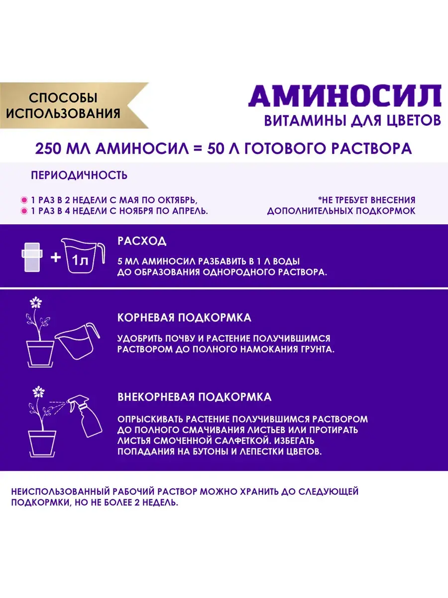 Концентрат Аминосил для садовых и комнатных домашних цветов это специально разработанный комплексный продукт, который способен обеспечить все необходимые элементы питания для здорового и красивого роста самых разных цветов. Удобрение содержит все важные макро и микроэлементы, которые способны улучшить здоровье и красоту, а также ингредиенты, которые способствуют более интенсивному и длительному цветению. Поможет укрепить корневую систему и улучшить общее состояние растений. Макро и микроэлементы. 40+ аминокислот. Рекомендуется использовать в течение всего периода роста и цветения. Это позволяет достичь максимального результата и обеспечить вашим комнатным растениям все необходимые элементы питания. Если вы хотите обеспечить здоровый и красивый рост своих растений, то удобрение для цветов - это идеальный выбор для вас. Оно подходит для ухода за самыми разными растениями и поможет создать прекрасный оазис красоты и здоровья в вашем доме. Жидкая подкормка для домашних балконных комнатных цветов: чайная бенгальская полиантовая роза, гортензии, фиалки орхидеи бегонии, спатифиллум, Антуриум, Диффенбахия, Бегония, Герань.