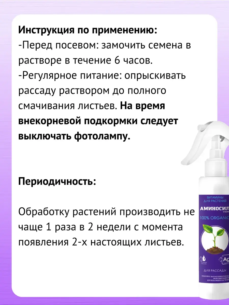 Специальный спрей для ухода за рассадой. Стимулирует рост, укрепляет растения и защищает от вредителей. Экологически чистый состав, удобный распылитель для легкого использования.