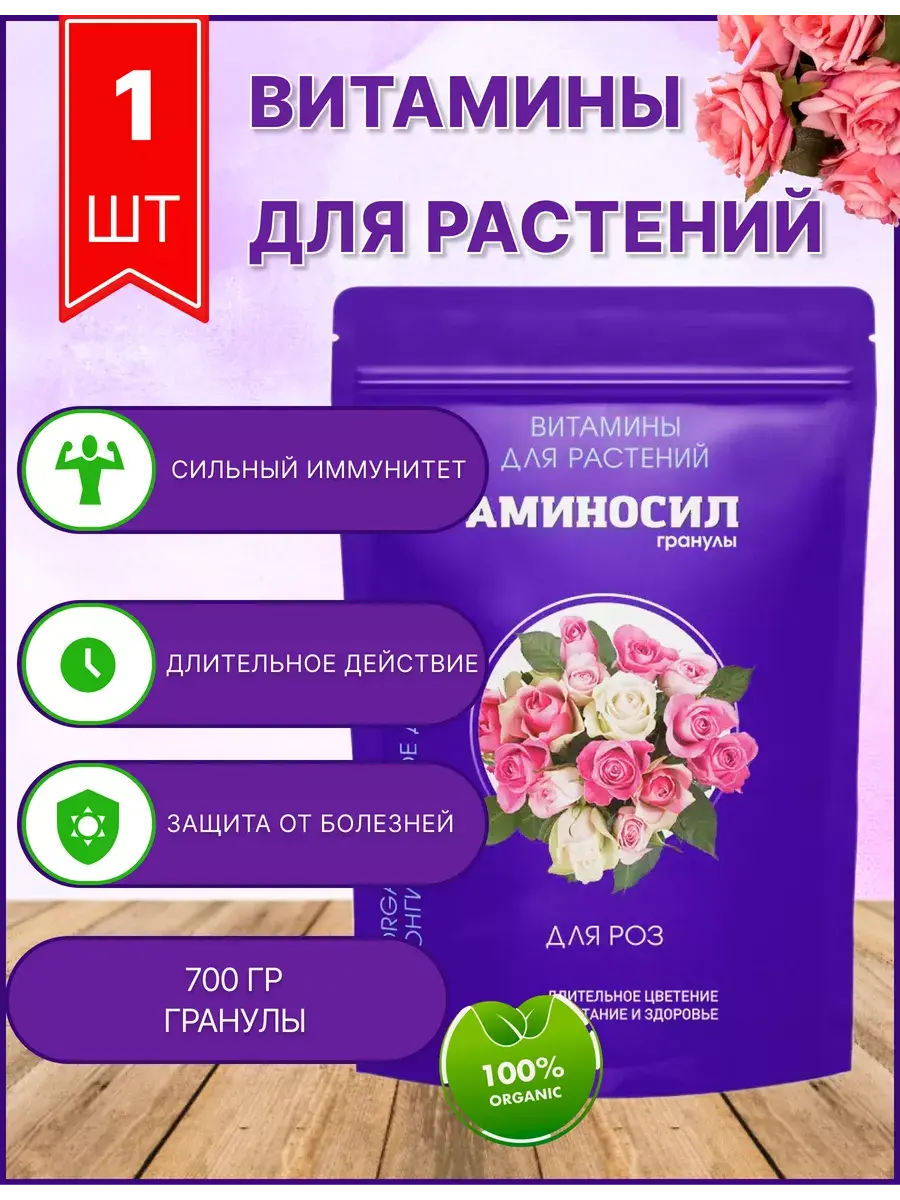 Витамины АМИНОСИЛ для роз в гранулах прекрасно подходят для полноценного сбалансированного питания всех сортов комнатных и садовых роз. Гранулы содержат все элементы питания, необходимые для здоровья и красоты цветов. Аминосил гранулы для роз в гранулах: ● обеспечивают активный рост и развитие роз; ● стимулируют обильное и продолжительное цветение; ● укрепляют розы, защищают корневую систему от загнивания; ● повышают стрессоустойчивость и зимостойкость; ● улучшают сопротивляемость болезням и вредителям; ● 100% органический состав - безопасны для людей и животных. ДОЗИРОВКА: 1 ч.л. = 5 гр, 1 горсть = 30 гр. Комнатные растения: 5 гр на 1 л кашпо, горшка или вазона. Период применения: 1 раз в месяц с мая по октябрь; 1 раз в 2 месяца с ноября по апрель. Садовые растения: 30 гр на м2 посадок. Период внесения: 1 раз в месяц в период с мая по август. СХЕМА ВНЕСЕНИЯ Посадка/пересадка: смешать с грунтом из расчета 60 гр на 1 саженец; тщательно пролить грунт; следующую подкормку рекомендуется производить не раньше, чем через 2 месяца. Регулярное питание: равномерно распределить гранулы по поверхности грунта; заделать в почву на глубину до 2 см или присыпать новым грунтом; тщательно полить грунт. Витамины для роз и пионов, предназначенное для удобрения и подкормки цветов в саду и в помещении. Это жидкое удобрение для цветущих растений, которое обеспечивает комплексное питание и стимулирует цветение. Пролонгированная формула удобрения для цветов гарантирует длительное питание розам и пионам, способствуя их здоровому росту и красивому цветению. Это комплексное удобрение для рассады цветов садовых, таких как роза и пион, которые требуют особого внимания и питательных веществ для достижения своего максимального потенциала.