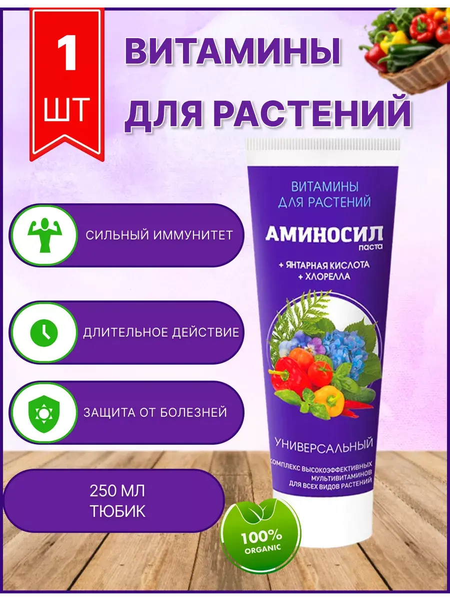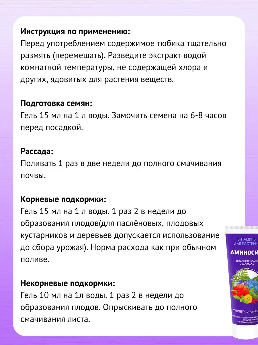 Витаминный комплекс АМИНОСИЛ в хелатной форме укрепляет структуру растения, усиливаем естественный иммунитет, улучшает усвояемость удобрений всех видов. Широкий комплекс биологически активных веществ обеспечивают здоровое развитие растений. Янтарная кислота активирует основные процессы роста и развития, повышает иммунитет растений. •увеличивает всхожесть семян до 100% и укрепляет рассаду•гарантирует богатый и здоровый урожай без химии•стимулирует и увеличивает продолжительность цветения •улучшает декоративность •укрепляет иммунитет и усиливает стрессоустойчивость •усиливает рост корневой системы •улучшает фотосинтез•усиливает сопротивляемость к болезням•обладает нейтральным запахом. СПОСОБ ПРИМЕНЕНИЯ:Перед употреблением содержимое тюбика тщательно размять (перемешать). Разведите экстракт водой комнатной температуры, не содержащей хлора и других, ядовитых для растения веществ. Цветочные и декоративные культуры. В период с марта по октябрь каждые 7-14 дней, с ноября по февраль каждые 30 дней. Корневые подкормки. Экстракт 15 мл на 1 л воды. Норма расхода как при обычном поливе. Некорневые подкормки. Экстракт 10 мл на 1л воды. Опрыскивать до полного смачивания листа. Подготовка семян(плодовые и декоративные культуры). Экстракт 15 мл на 1 л воды. Замочить семена на 6-8 часов перед посадкой. Рассада. Поливать 1 раз в две недели до полного смачивания почвы. Корневые подкормки. Экстракт 15 мл на 1 л воды. 1 раз 2 в недели до образования плодов(для паслёновых, плодовых кустарников и деревьев допускается использование до сбора урожая). Норма расхода как при обычном поливе. Некорневые подкормки. Экстракт 10 мл на 1л воды. 1 раз 2 в недели до образования плодов. Опрыскивать до полного смачивания листа.К сведению: 1 чайная ложка = 5 мл.1 столовая ложка = 15мл. Условия хранения: в защищённом от света месте при температуре от +1°С до +25°С.Срок хранения: 36 месяцев.