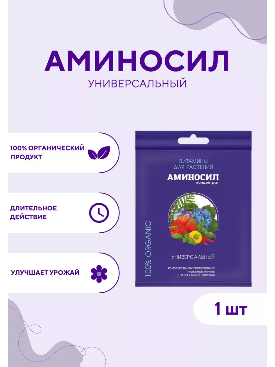 Препарат Аминосил универсальный имеет 100% органический состав и создан для полноценного сбалансированного питания всех типов растений. Витамины в составе подкормки для цветов и садовых культур и укрепляют растение и защищают корневую систему, формируют сильный естественный иммунитет и повышают стрессоустойчивость. Применение универсального удобрения обеспечивает максимальную урожайность, восстанавливает и улучшает декоративность растений. Витаминный органический комплекс безопасен для людей и животных. ПРИМЕНЕНИЕ. Разбавить концентрат водой согласно инструкции, до образования однородного раствора. Лучший результат дает совмещение корневой (полив) и внекорневой (опрыскивание) подкормки. Полив производить до полного намокания грунта. При опрыскивании по листу избегать попадания на лепестки и бутоны. Комнатные растения: 5мл на 1л. 2 раза в месяц с мая по октябрь и 1 раз в месяц с ноября по апрель. Период для садовых цветов: 2 раза в месяц с апреля по август. Плодовые культуры: 20мл на 1л. 1 раз в 2 недели до цветения, 1 раз в конце сезона для ускорения созревания плодов. Декоративные деревья и кустарники: 20 мл на 1 л2 раза в месяц с апреля по август. Замачивание семян, луковиц, клубней, черенков: 5 мл на 1 л воды. Замачивать семена - 6 часов, луковицы и клубни - 2,5 часа, черенки - выдерживать в растворе вертикально 12 часов.