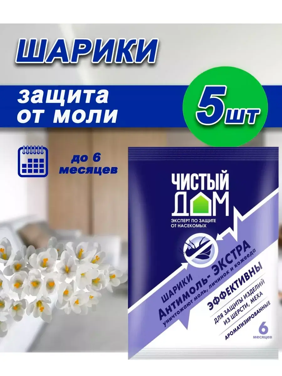 Ароматизированные шарики от моли Антимоль Экстра, 40 гр – надежная защита шерсти, меха, и изделий из них от повреждения гусеницей, личинкой моли. ПРИМЕНЕНИЕ: таблетки разместить среди подготовленных к хранению шерстяных вещей из расчета 2-3 шт на одну секцию стандартного платяного шкафа, ящика, антресоли, короба. Антимоль экстра эффективно работает в течении 6 месяцев. Моль и ее личинки и кожеед погибают от эффективного действующего вещества, которое работает на всех стадиях развития насекомого. Применяется в основном при уничтожении платяной и ковровой моли, гусениц кожеедов. Именно личинки портят вещи. Саше от бабочек моли эффективны в течение 6 месяцев с момента извлечения ее из упаковки изготовителя. Средство можно перемещать в разные места в течение срока их действия. Используйте шарики от моли для шубы, именно Чистый дом справится с задачей защиты шерстяных вещей от моли. Меры предосторожности: избегать контакта средства с кожей, при попадании в глаза и на кожу обильно промыть водой. Лицам, страдающим аллергическими заболеваниями, высокочувствительным к запахам, применять средство с осторожностью. После работы со средством вымыть руки водой с мылом. В упаковке 10 шариков.