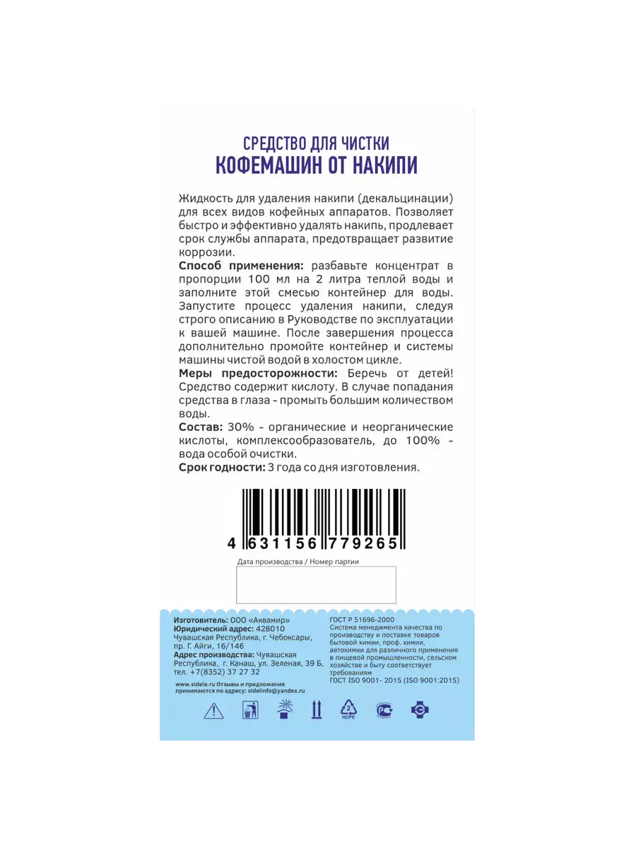 Средство для чистки кофемашин от накипи "сидель" обладает высоким антибактериальным свойством, что помогает бороться с различными видами бактерий и микроорганизмов, которые могут размножаться внутри кофемашины. Также, средство защищает от образования новой накипи на поверхностях кофемашины, благодаря чему она остается чистой и готова к использованию в любое время.
