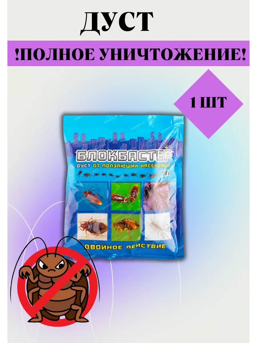 Дуст Блокбастер порошок от тараканов,клопов,блох,муравьев 100гр. от ползающих насекомых - это отрава от тараканов эффективная при правильном применении. Данный порошок имеет двойной эффект. Дуст мощно бьёт тараканов. Это средство также используется как средство от блох в квартире. Его можно использовать порошком или в виде эмульсии. Порошок рассыпается в местах обитания, скопления и передвижения насекомых, а затем сметается с поверхностей, которые промываются мыльно-содовым раствором. Для эмульсии дуст разводится в воде в определённом соотношении, переливается в ёмкость с пульверизатором и распыляется в местах появления вредных насекомых. Приминение : 1 способ — проколоть толстой иглой угол пакета в 5–10 точках или обрезать угол пакета так, чтобы образовалось небольшое отверстие. Взять за противоположный конец пакета и, осторожно потряхивая, нанести дуст тонким слоем на места обитания, скопления или передвижения насекомых.Рассыпанный порошок оставить для воздействия на насекомых, а затем тщательно собрать и промыть поверхность мыльно-содовым раствором. Для длительного воздействия его можно оставить в труднодоступных местах: воздуховоды или за плинтусами и любые щели с целью профилактики. 2 способ — приготовление эмульсии: 10 г порошка развести в 10 л воды. При помощи пульвелизатора распылить на поверхности. Для уничтожения Тараканов — обработать места их скопления и передвижения, плинтуса и стыки кафельных плит. Эффективным будет и обработка вентиляционных отверстий, около водопроводных и отопительных труб и др. от клопов — заднюю поверхность ковров и мебели, картин и диванов, щели в плинтусах. от Муравьев — пути их передвижения («дорожки»). от Блох — плинтуса и щели между ними и стены на высоту до 1 м, щели в полу. Подстилки и коврики для животных обработать с нижней стороны, через сутки тщательно выбить. Через 3 суток постирать перед использованием.