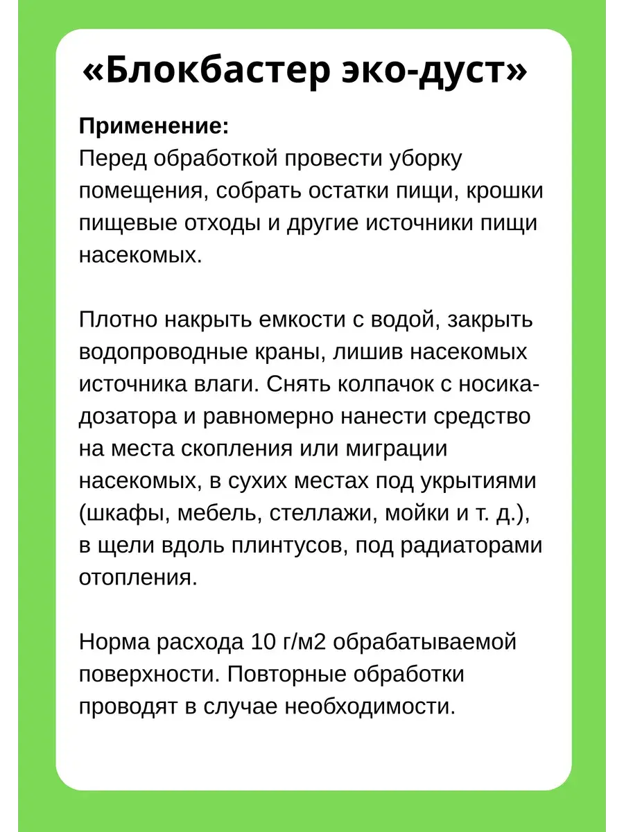 Средство инсектицидное "Блокбастер ЭКО-дуст от тараканов" - это надежное решение для борьбы с рыжими и черными тараканами, чешуйницами и сверчками в доме.Одним из главных преимуществ этого продукта является отсутствие запаха, что делает его более привлекательным для использования в помещениях. Продукт обладает двойным эффектом, действуя как на физическом, так и на химическом уровне."Блокбастер ЭКО-дуст от тараканов" безопасен для здоровья людей и домашних животных, поэтому можно использовать его в домах с детьми и домашними питомцами.Механизм действия основан на кишечно-контактном воздействии на насекомых. Диатомит обеспечивает механические повреждения хитиновых оболочек насекомых и обезвоживание их организма, а натрия тетраборат "разъедает" изнутри и обезвоживает ткани на уровне обменных процессов.Средство инсектицидное "Блокбастер ЭКО-дуст от тараканов" - это эффективный, безопасный и удобный способ борьбы с насекомыми в доме.