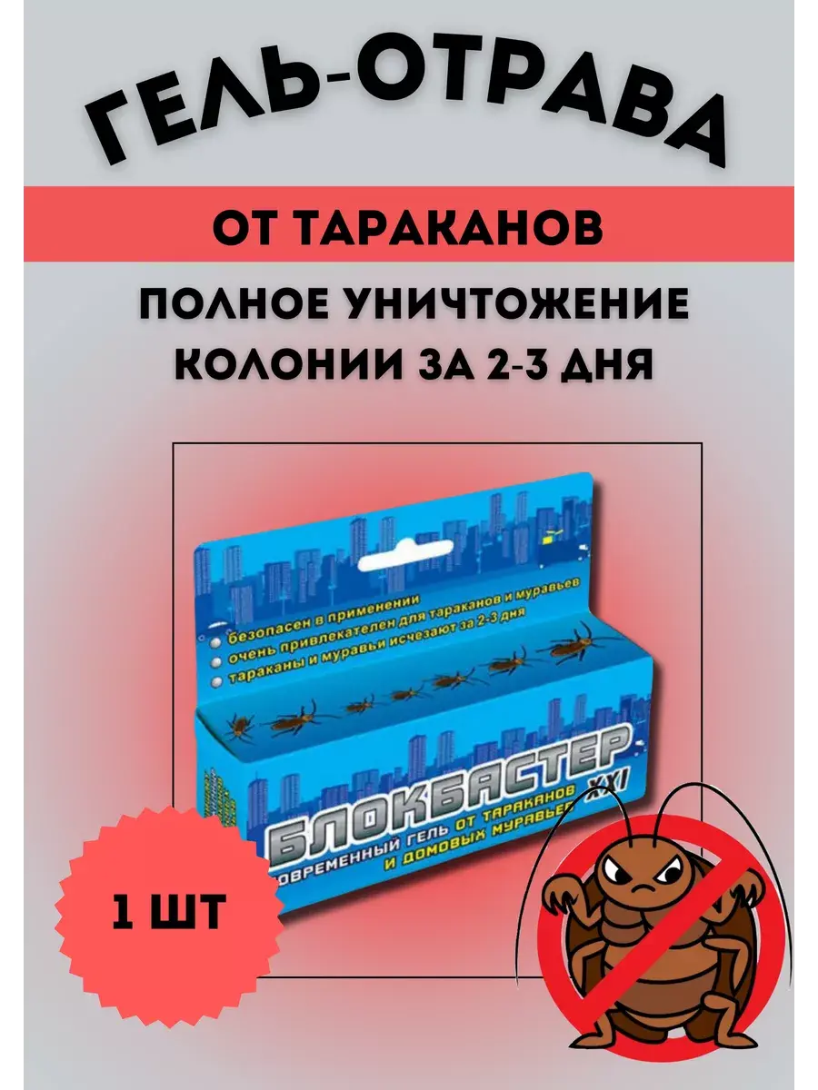 Гель от тараканов и бытовых муравьев БЛОКБАСТЕР XXI, 45 г. - мощное эффективное средство, позволяющее быстро истребить ненужных насекомых за короткий срок. ► ОСОБЕННОСТИ: Отрава обладает «каскадным» эффектом: даже один съевший прусак передает смертельную дозу яда своим сородичам. Входящие в ее состав привлекатели заставляют тараканов предпочитать эту приманку любой другой пище. Гель не портится, не высыхает и не теряет своей эффективности очень долгое время. Не имеет неприятного запаха, не выделяет в воздух вредных веществ и может применяться людьми, страдающими аллергией или астмой. Входящая в его состав, горькая для млекопитающих добавка «битрекс» предотвращает случайное поедание геля домашними животными. Гель бесцветен и не заметен на обрабатываемых поверхностях. Один шприц-дозатор рассчитан на обработку помещений площадью 70–100 м². ► ПРИМЕНЕНИЕ: нанести отраву пунктиром (2 см геля — 2 см необработанной поверхности) вдоль плинтусов, в щели и другие отверстия. Гель можно наносить на подложки (по 5–6 полосок длиной 6–9 см с интервалами 1–2 см) и расставлять их в местах обитания, скопления и передвижения рыжих. Массовая гибель тараканов наступает на вторые сутки. «Блокбастер XXI» может быть использован также против домовых муравьев. После гибели тараканов рекомендуется оставить «Блокбастер XXI» в точках расположения еще на 2–4 недели, чтобы уничтожить вновь отродившуюся молодь и тараканов-разведчиков других колоний. В случае высокой заселенности насекомыми всего многоэтажного дома, подвалов и т.п. рекомендуется оставить гель для постоянного нахождения в некоторых «стратегических» точках (вентиляционных каналах, у стояков канализационных труб, за кухонной мебелью, под холодильником и т.п.). «Блокбастер XXI» обладает очень высокой стабильностью и сохраняет свои свойства длительное время. Срок годности: 3 года.
