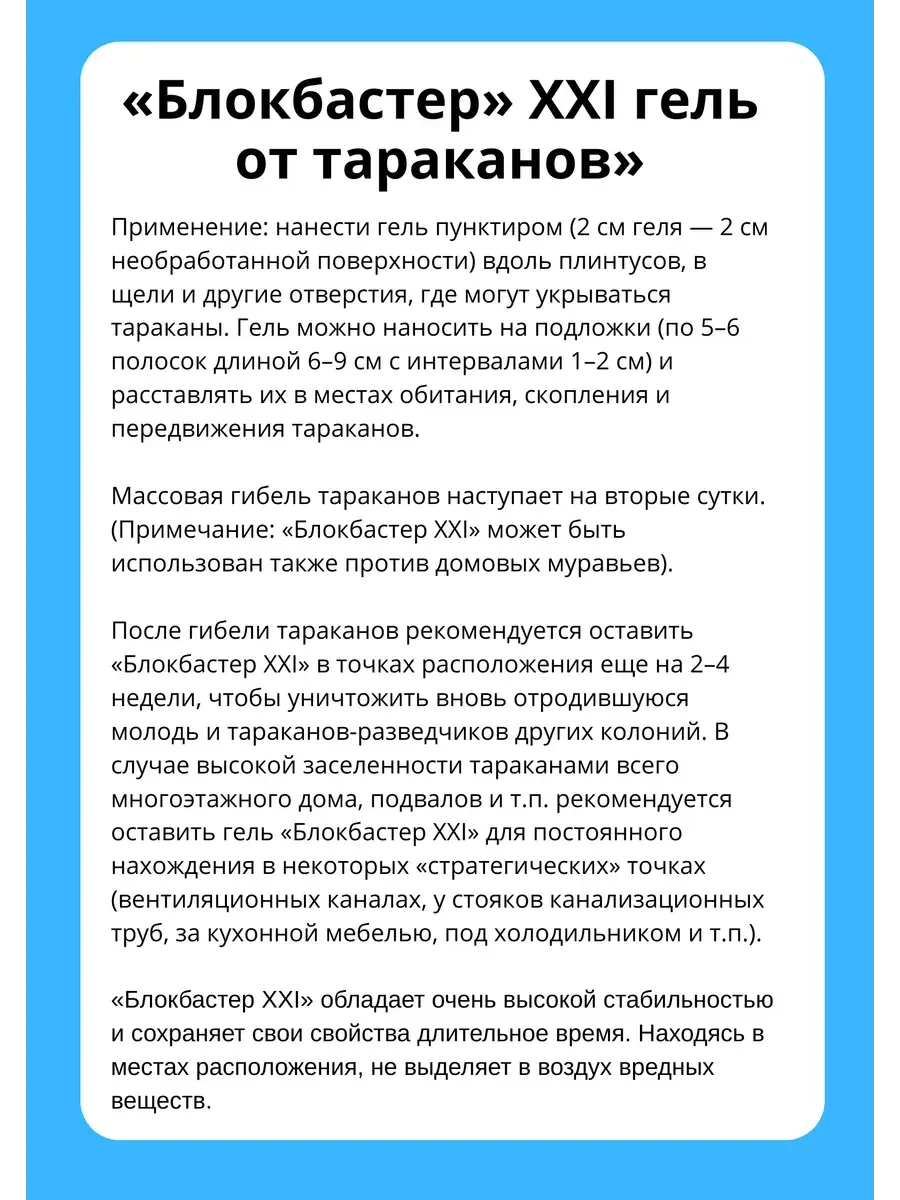 Блокбастер ХХI гель - современный гель от тараканов.Гель уже через 2-3 дня полностью истребляет всех тараканов. Гель обладает ""каскадным"" эффектом.Входящие в его состав привлекатели заставляют тараканов предпочитать эту приманку любой другой пище.Гель ""Блокбастер"" не портится, не высыхает и не теряет своей эффективности очень долгое время. Гель удобен в применении, легко наносится в труднодоступные места.Не имеет неприятного запаха, не выделяет в воздух вредных веществ и может применяться людьми, страдающими аллергией и астмой.Входящая в его состав добавка ""битрекс"" предотвращает случайное поедание геля домашними животными.Гель бесцветен и не заметен на обрабатываемых поверхностях.Применение: нанести гель пунктиром вдоль мест укрытия тараканов