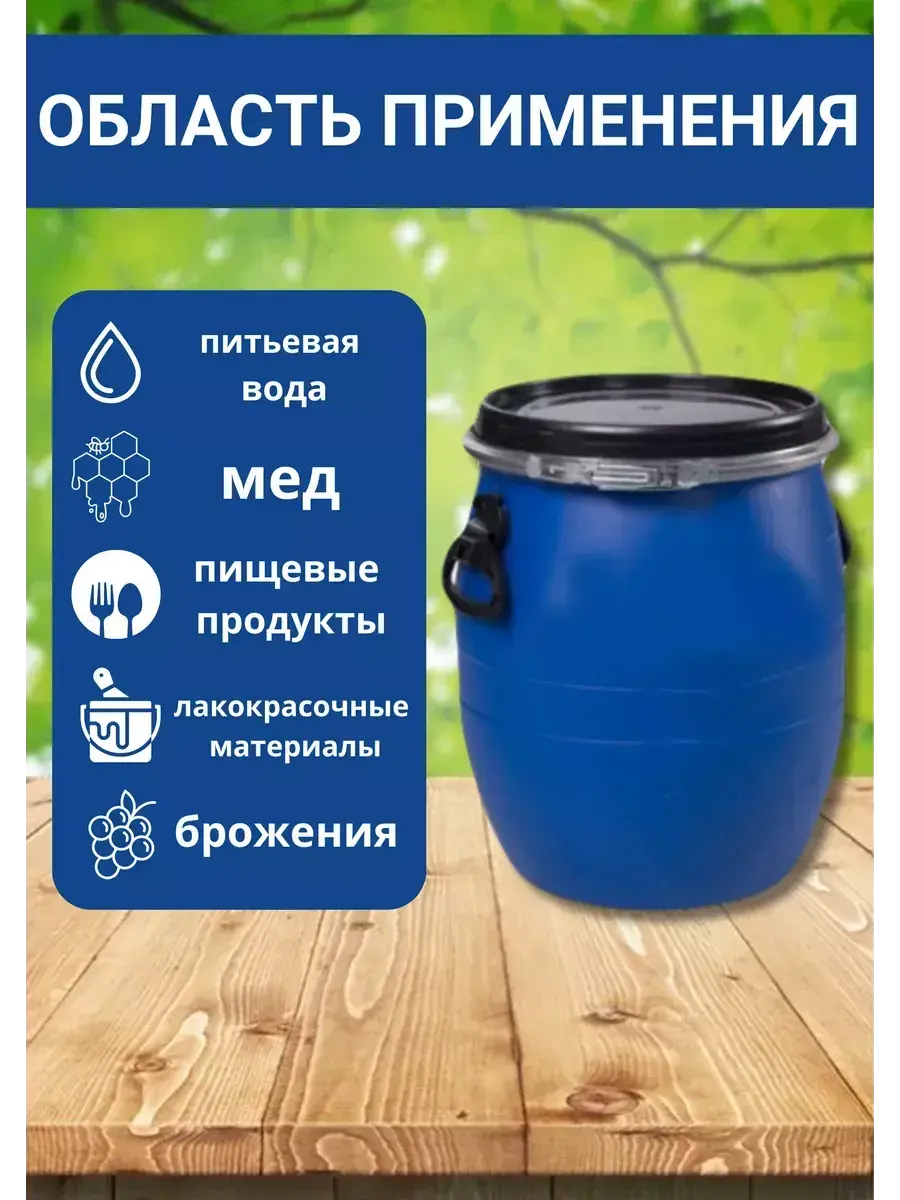 Широкая горловина сокращает время фасовки и растаривания. Крышка с полиуретановым уплотнителем обеспечивает герметичность бочки. Надежный металлический хомут с немецким замком надежно фиксирует крышку. Шплинт для пломбирования позволяет сохранить содержимое бочек нетронутым. Стрелка предохраняет бочку от деформации из-за температурных перепадов до момента фасовки. Удобные, надежные и безопасные пластиковые ручки максимально облегчают процесс переноски бочек. Дно и верхняя поверхность крышки конструктивно сопрягаются, что позволяет штабелировать изделия.