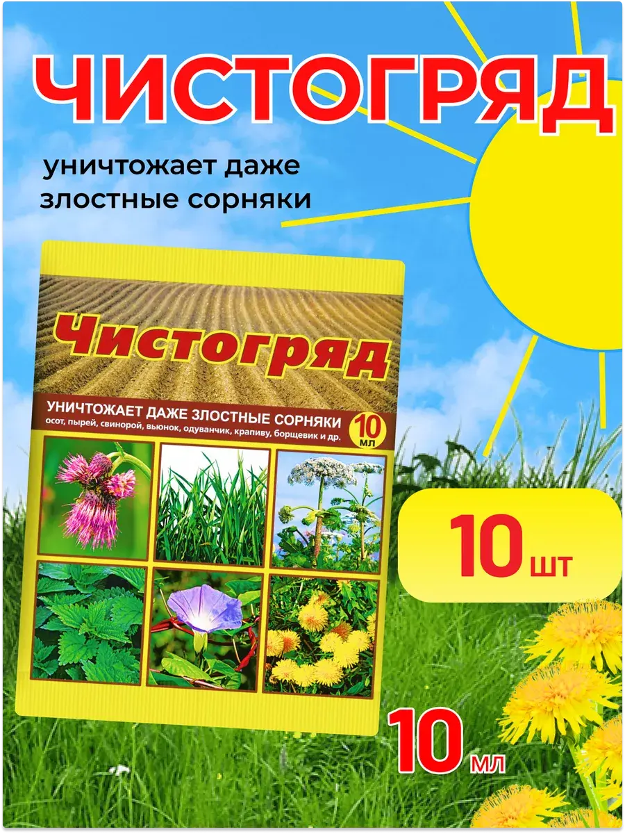 Гербицид широкого спектра действия Чистогряд . Препарат для уничтожения однолетних и многолетних злаковых и двудольных сорняков, в том числе злостных. Применяется при опрыскивании вегетирующих сорняков до посадки картофеля, овощных и цветочных культур или до посева газонов, при опрыскивании сорняков в послеуборочный период, на межах и т. п. — в период вегетации. Гербицид эффективно справляется с такими сорняками как пырей, осот, свинорой, вьюнок, одуванчик, крапива, борщевик и другими злостными сорными растениями. Применение: Отмеренное количество препарата необходимо развести в пластиковой или эмалированной емкости с небольшим количеством воды (1 л) и тщательно. Затем рабочий состав довести до требуемого объема. Кратность обработок — 1. Не рекомендуется опрыскивать перед дождем. Сроки выхода для проведения ручных работ — 3 дня.