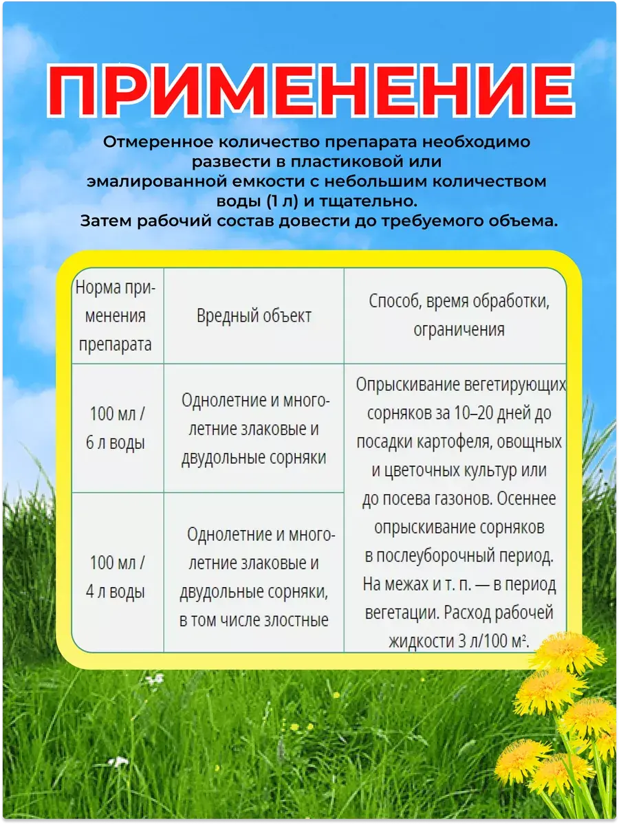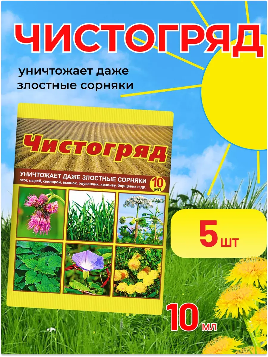 Гербицид широкого спектра действия Чистогряд . Препарат для уничтожения однолетних и многолетних злаковых и двудольных сорняков, в том числе злостных. Применяется при опрыскивании вегетирующих сорняков до посадки картофеля, овощных и цветочных культур или до посева газонов, при опрыскивании сорняков в послеуборочный период, на межах и т. п. — в период вегетации. Гербицид эффективно справляется с такими сорняками как пырей, осот, свинорой, вьюнок, одуванчик, крапива, борщевик и другими злостными сорными растениями. Применение: Отмеренное количество препарата необходимо развести в пластиковой или эмалированной емкости с небольшим количеством воды (1 л) и тщательно. Затем рабочий состав довести до требуемого объема. Кратность обработок — 1. Не рекомендуется опрыскивать перед дождем. Сроки выхода для проведения ручных работ — 3 дня.