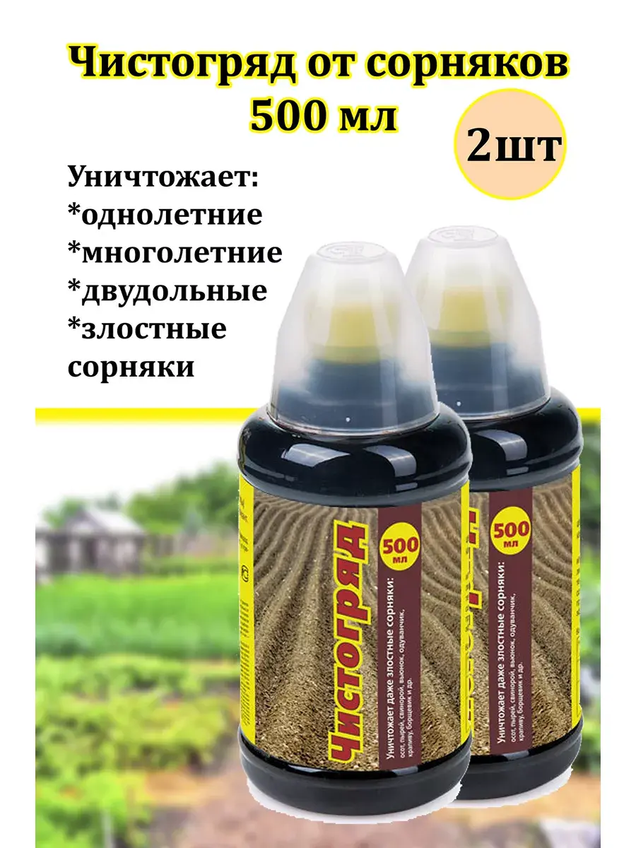 Гербицид широкого спектра действия Чистогряд . Препарат для уничтожения однолетних и многолетних злаковых и двудольных сорняков, в том числе злостных. Применяется при опрыскивании вегетирующих сорняков до посадки картофеля, овощных и цветочных культур или до посева газонов, при опрыскивании сорняков в послеуборочный период, на межах и т. п. — в период вегетации. Гербицид эффективно справляется с такими сорняками как пырей, осот, свинорой, вьюнок, одуванчик, крапива, борщевик и другими злостными сорными растениями. Применение: Отмеренное количество препарата необходимо развести в пластиковой или эмалированной емкости с небольшим количеством воды (1 л) и тщательно. Затем рабочий состав довести до требуемого объема. Кратность обработок — 1. Не рекомендуется опрыскивать перед дождем. Сроки выхода для проведения ручных работ — 3 дня. Средство от сорняков Чистогряд 500 мл - это незаменимое средство для защиты растений от сорняков. В почве "Чистогряд" распадается на естественные вещества. Однако, не стоит забывать, что гербицид слошного действия и является отравой для травы растений, поэтому его следует использовать осторожно и только по назначению. При применении гербицида необходимо следить за тем, чтобы он не попал на соседние культуры или растения, которые не нуждаются в защите от сорняков.ДОЗИРОВКА: однолетние и многолетние сорняки – 100 мл на 6 л воды, злостные сорняки – 100 мл на 4 л воды. Скорость воздействия на сорные растения происходит в течение нескольких часов после проведения обработки, что позволяет быстро и эффективно избавиться от сорняков. Гербицид от сорняков Чистогряд - это отличное средство против сорняков на посадках земляники и газонах. Применение средства от сорняков эффективно. Гербицид быстродействующий и избирателен к многим культурам, что делает его незаменимым инструментом для садоводов и огородников.