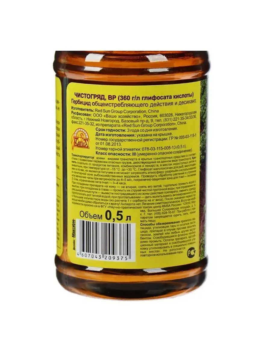Гербицид широкого спектра действия Чистогряд . Препарат для уничтожения однолетних и многолетних злаковых и двудольных сорняков, в том числе злостных. Применяется при опрыскивании вегетирующих сорняков до посадки картофеля, овощных и цветочных культур или до посева газонов, при опрыскивании сорняков в послеуборочный период, на межах и т. п. — в период вегетации. Гербицид эффективно справляется с такими сорняками как пырей, осот, свинорой, вьюнок, одуванчик, крапива, борщевик и другими злостными сорными растениями. Применение: Отмеренное количество препарата необходимо развести в пластиковой или эмалированной емкости с небольшим количеством воды (1 л) и тщательно. Затем рабочий состав довести до требуемого объема. Кратность обработок — 1. Не рекомендуется опрыскивать перед дождем. Сроки выхода для проведения ручных работ — 3 дня. Средство от сорняков Чистогряд 500 мл - это незаменимое средство для защиты растений от сорняков. В почве "Чистогряд" распадается на естественные вещества. Однако, не стоит забывать, что гербицид слошного действия и является отравой для травы растений, поэтому его следует использовать осторожно и только по назначению. При применении гербицида необходимо следить за тем, чтобы он не попал на соседние культуры или растения, которые не нуждаются в защите от сорняков.ДОЗИРОВКА: однолетние и многолетние сорняки – 100 мл на 6 л воды, злостные сорняки – 100 мл на 4 л воды. Скорость воздействия на сорные растения происходит в течение нескольких часов после проведения обработки, что позволяет быстро и эффективно избавиться от сорняков. Гербицид от сорняков Чистогряд - это отличное средство против сорняков на посадках земляники и газонах. Применение средства от сорняков эффективно. Гербицид быстродействующий и избирателен к многим культурам, что делает его незаменимым инструментом для садоводов и огородников.