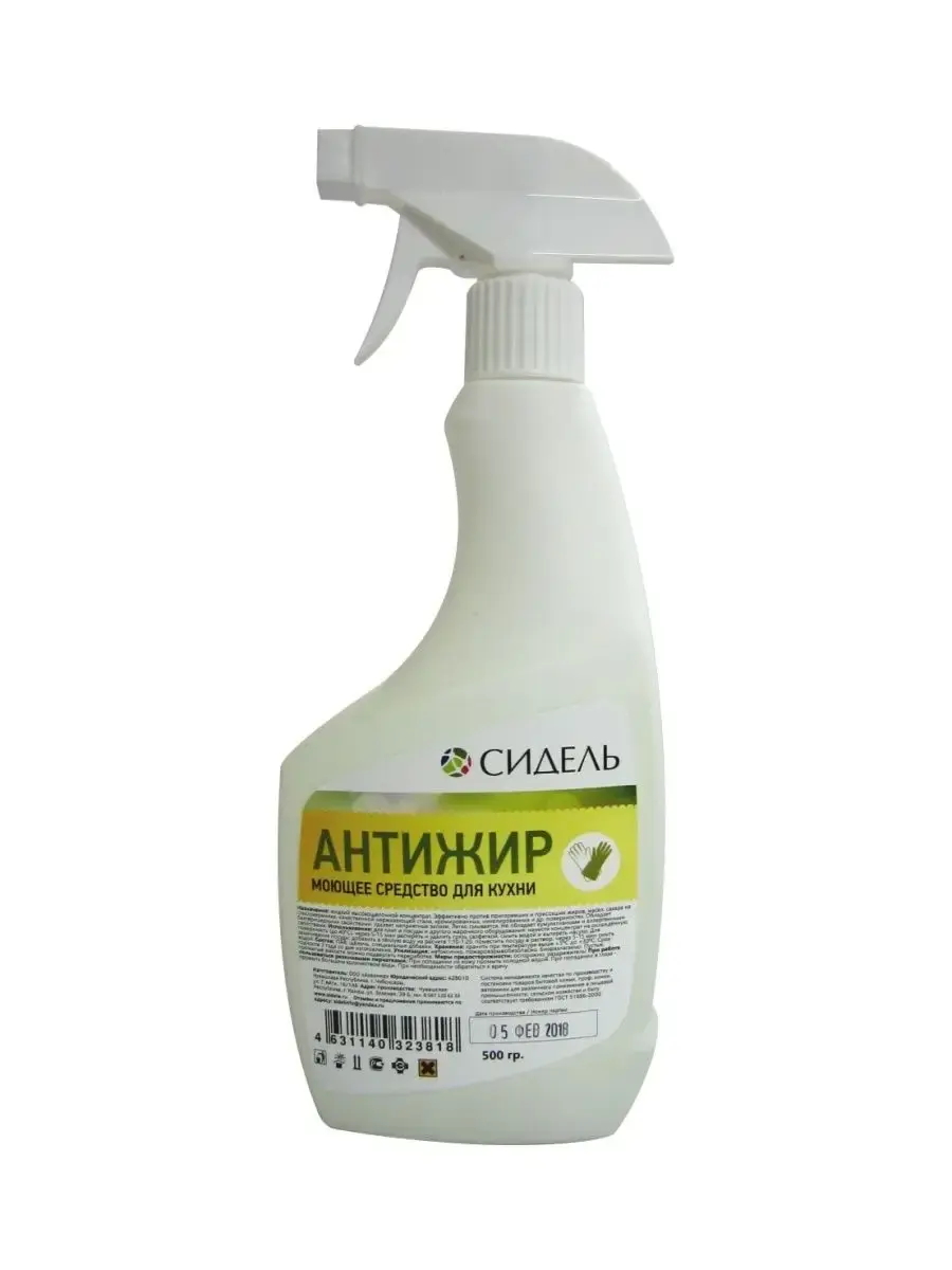 Чистящее средство для кухни Антижир спрей 500 мл от Sidel - современная бытовая химия, является отличным помощником для уборки дома. Обладает мощной пеной, бережно очищает поверхность и поддерживает ежедневную чистоту без лишних усилий. Удаляет жир, нагар, копоть и пригоревшую пищу с эмалированных, хромированных поверхностей, изделий из стекла, нержавеющей стали, фаянса, фарфора, кухонных плит, мультиварок, фритюрниц, грилей, духовых шкафов и микроволновых печей. Прекрасный стеклоочиститель. Жироудалитель антижир содержит активные вещества, расщепляющие жир, действие которых гарантирует быстрый результат без особых усилий. Содержащие в составе активные вещества, которые позволяют очистить до блеска даже фритюрный прибор. Моющие средства сделает кухню максимально чистой и блестящей. Многофункциональное средство анти жир подойдет для мытья окон, стекол или зеркал от капель жира или других трудно удаляемых пятен. Достаточно нанести растворитель на поверхность, а через полминуты смыть водой или протереть тряпкой. Попробуйте всю линейку бытовой химии универсальных чистящих и моющих средств от Сидель : средство для мытья окон и зеркал, средство для сантехники средство для ванной и унитаза, средство для кухни антижир , из которой можно собрать отличный набор для уборки вашего дома
