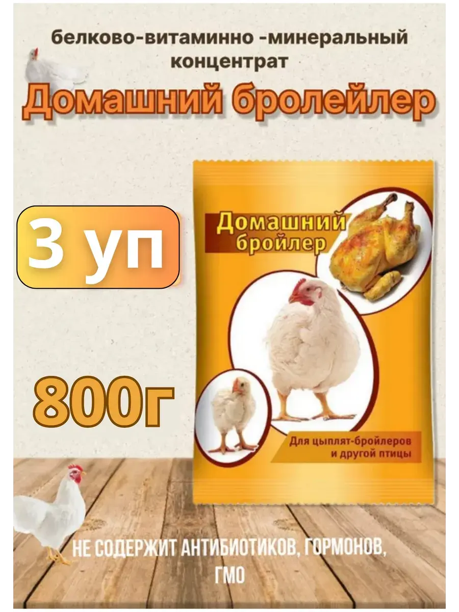 Кормовая добавка “Домашний бройлер” - это сбалансированный комплекс витаминов, минералов, аминокислот и других биологически активных веществ, разработанный специально для домашних бройлеров – цыплят мясных пород. Эта добавка способствует здоровому росту, развитию и укреплению иммунитета цыплят, обеспечивает их правильное формирование и развитие внутренних органов, улучшает обмен веществ и устойчивость к различным заболеваниям. Белково-витаминно-минеральный концентрат. Для выращивания цыплят-бройлеров и другой птицы. На период с 2 по 42 день откорма на одного цыпленка-бройлера нужно 800 г добавки.
