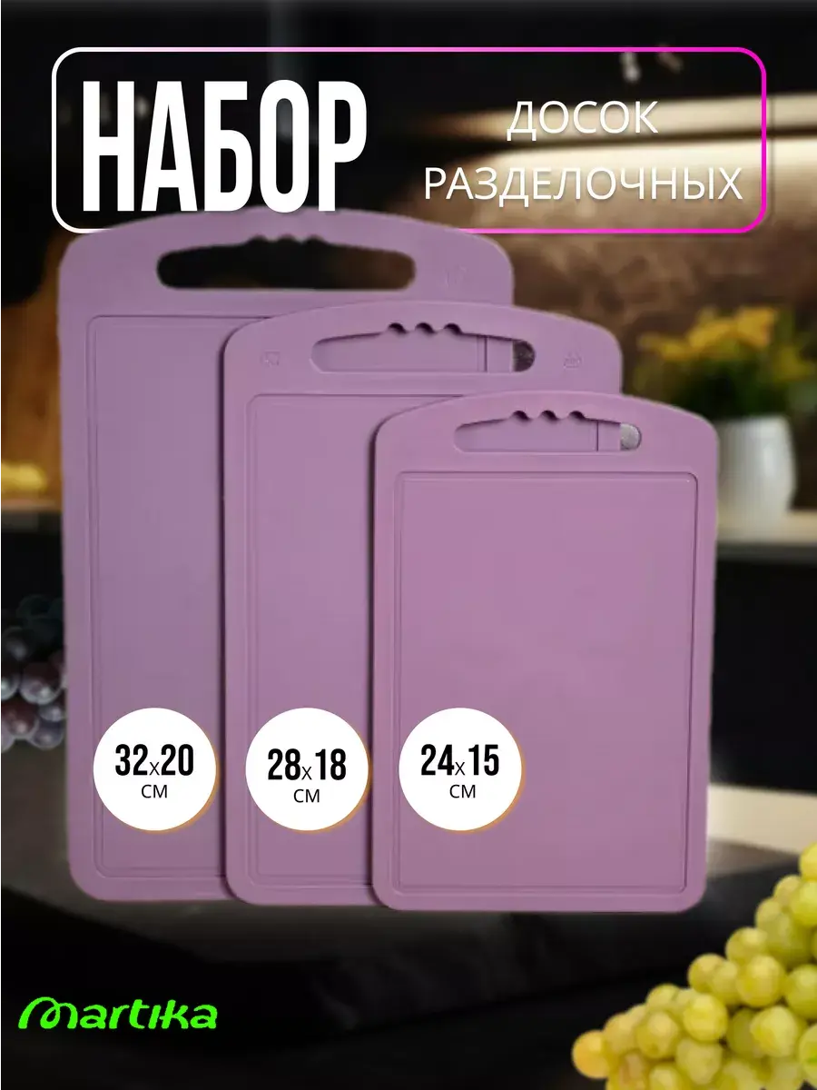 В набор входят три доски из прочного полипропилена высокого давления. Размеры досок: 15*24см, 18*28см, 20*32см. Доски легко мыть, в т.ч. в посудомоечной машине, они не впитывают запахи и не окрашиваются от продуктов. Матовая поверхность защищает от образования царапин, скольжения и не тупит лезвие ножа. Отличная идея для подарка любой хозяйке!