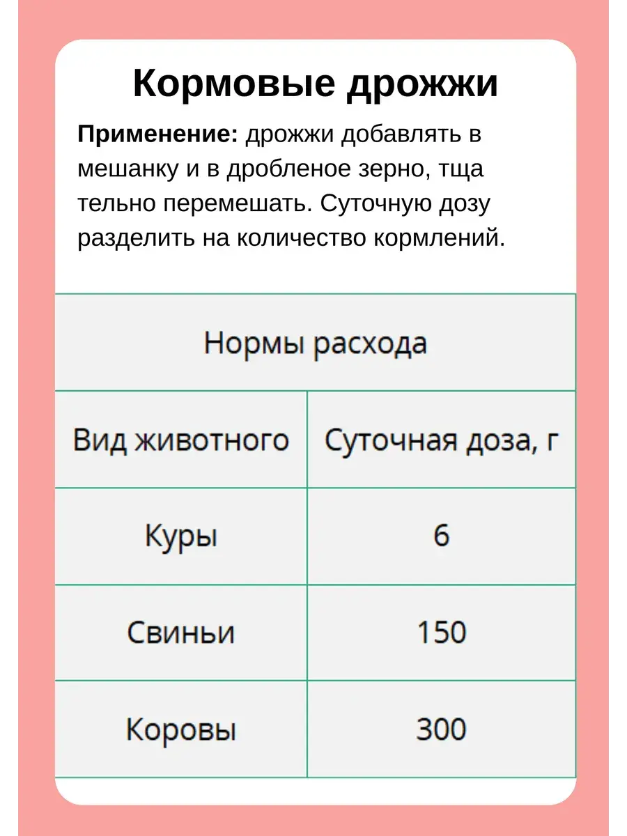 Подкормка дрожжи кормовые, 1 кг. в пакете. Набор из 3шт. Минеральная добавка, улучшает белковый минеральный обмен. Кормовые дрожжи - натуральный экологически чистый продукт, не содержит гормонов и стимуляторов роста. Полезная добавка используется в рационе сельскохозяйственной живности. Внешне кормовые дрожжи имеют темно-коричневый или бежевый цвет, продаются в виде порошка с сильным запахом. Рекомендованы к использованию в фермерских и частных подсобных хозяйствах. Кормовые дрожжи в качестве добавки к основному корму используют для улучшения белкового и минерального обмена, повышения витаминной обеспеченности всех видов сельскохозяйственных животных и птиц. Протеин дрожжей по своей питательности приближается к белкам животного происхождения. Белки дрожжей богаты аминокислотами. Витамины и добавки обеспечивают организм витаминами группы В. Благодаря витаминам для кур у птиц увеличивается их выносливость и производительность. Кормовые дрожжи обогащены пробиотиком повышающим усвояемость зерновых кормов. Вес упаковки 1 кг. Состав 100% натуральный. Применение: дрожжи добавляют в еду тщательно перемешивают. Условия хранения: В сухом, защищённом от прямых солнечных лучей, прохладном месте.