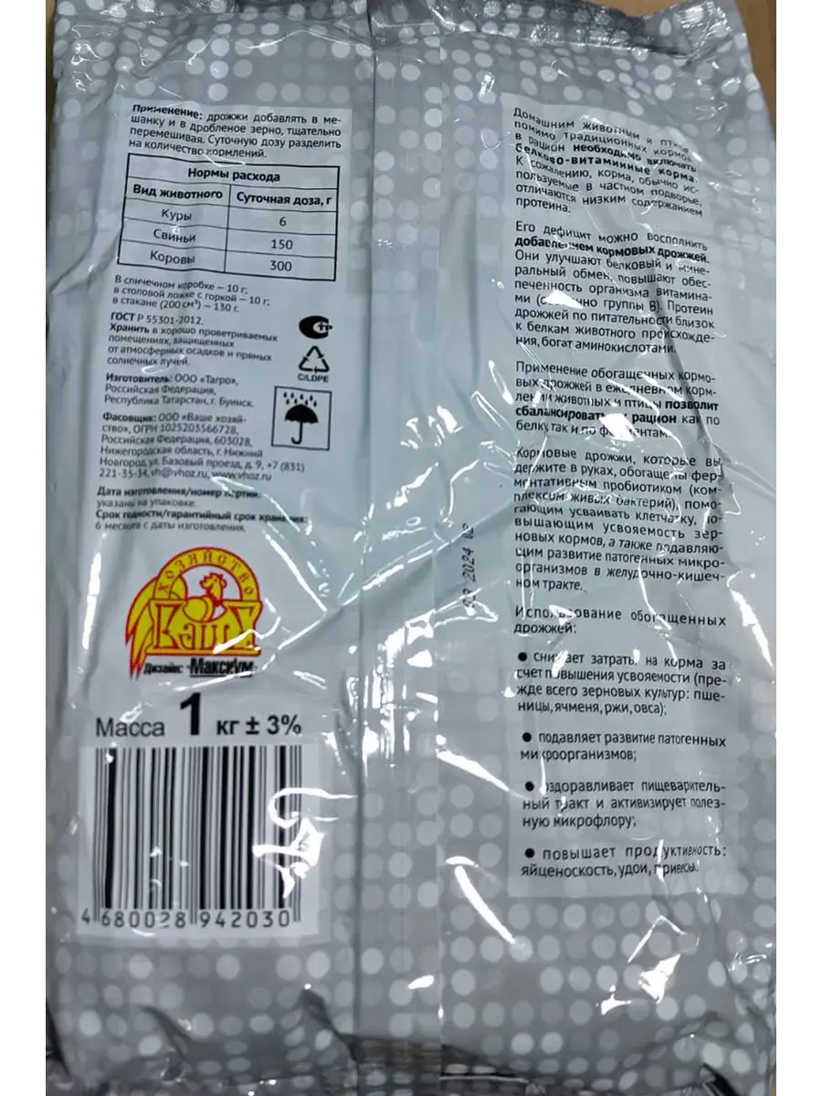 Подкормка дрожжи кормовые, 1 кг. в пакете. Набор из 5шт. Минеральная добавка, улучшает белковый минеральный обмен. Кормовые дрожжи - натуральный экологически чистый продукт, не содержит гормонов и стимуляторов роста. Полезная добавка используется в рационе сельскохозяйственной живности. Внешне кормовые дрожжи имеют темно-коричневый или бежевый цвет, продаются в виде порошка с сильным запахом. Рекомендованы к использованию в фермерских и частных подсобных хозяйствах. Кормовые дрожжи в качестве добавки к основному корму используют для улучшения белкового и минерального обмена, повышения витаминной обеспеченности всех видов сельскохозяйственных животных и птиц. Протеин дрожжей по своей питательности приближается к белкам животного происхождения. Белки дрожжей богаты аминокислотами. Витамины и добавки обеспечивают организм витаминами группы В. Благодаря витаминам у кур, у птиц увеличивается их выносливость и производительность. Кормовые дрожжи обогащены пробиотиком повышающим усвояемость зерновых кормов. Вес упаковки 1 кг. Состав 100% натуральный. Применение: дрожжи добавляют в еду тщательно перемешивают. Условия хранения: В сухом, защищённом от прямых солнечных лучей, прохладном месте. Белковая добавка улучшает белковый и минеральный обмен, повышает обеспеченность организма витаминами группы В.