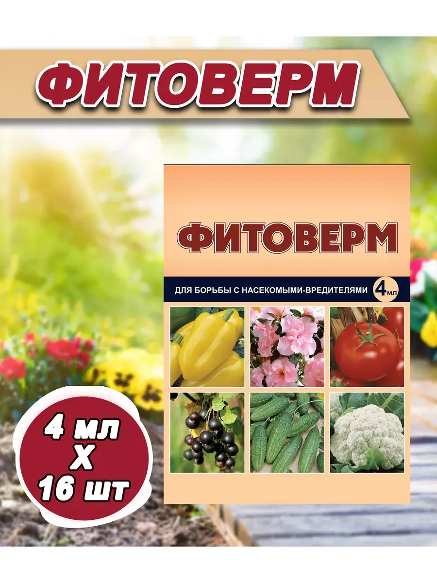 Незаменимый препарат, средство от насекомых для защиты растений Фитоверм, 4 мл. в жидкой форме. Инсектоакарицид для борьбы с грызущими и сосущими насекомыми-вредителями сада и огорода в личных подсобных хозяйствах. Эффективен против 20 видов насекомых-вредителей, в том числе колорадского жука; капустной белянки; капустной совки; паутинного клеща; яблонной плодожорки; цветоедов; трипсы; всех видов тли. Средство не загрязняет окружающую среду, быстро разрушаясь в воде и почве. Можно применять даже за 2-3 дня до сбора урожая. Срок ожидания от последней обработки до сбора урожая — не более 3-х суток. «Фитоверм» практически незаменимый препарат для защиты от вредителей смородины, крыжовника, малины, яблони и других плодовых деревьев, томатов, цветов (и в саду, и в комнате), ведь применение многих химических препаратов разрешено только не позднее 20 дней до сбора урожая. Приготовление рабочего раствора для опрыскивания растений: как разводить фитоверм для растений расчетное количество препарата растворяют в небольшом количестве воды и при постоянном перемешивании доводят объем воды до требуемого уровня. Рабочий раствор используют в день приготовления. Опрыскивать растения свежеприготовленным раствором в сухую, безветренную погоду, желательно утром (до 10 часов) или вечером (18–22 часа), равномерно смачивая листья, за 4–6 часов до дождя. Оптимальная температура при обработках от +12 °С до +25 °С. Не распылять против ветра. Раствор хранению не подлежит, использовать в течение суток. Скорость воздействия: через 6–8 часов в защищенном грунте, 8–10 часов в открытом грунте после обработки. Защищает растения в закрытом грунте от 7 до 20 суток. Не селективен. Не фитотоксичен. Проводить обработку утром или вечером, при скорости ветра ≤ 2–3 м/с, погранично-защитная зона для пчёл не менее ≤ 4–5 км, ограничение лёта пчёл — 1–2 сут. Срок годности: 2 года.