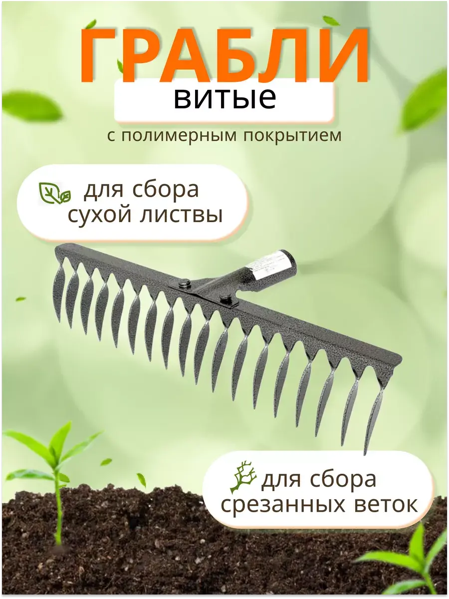 Грабли витые 18-зубые "Рельсовая Сталь" с полимерным покрытием - это инструмент, который служит для сбора и перемещения листьев, мелкого мусора и других садовых отходов. Они имеют специальное витое устройство, состоящее из двенадцати зубьев, которые позволяют эффективно схватывать и поднимать мусор с земли.