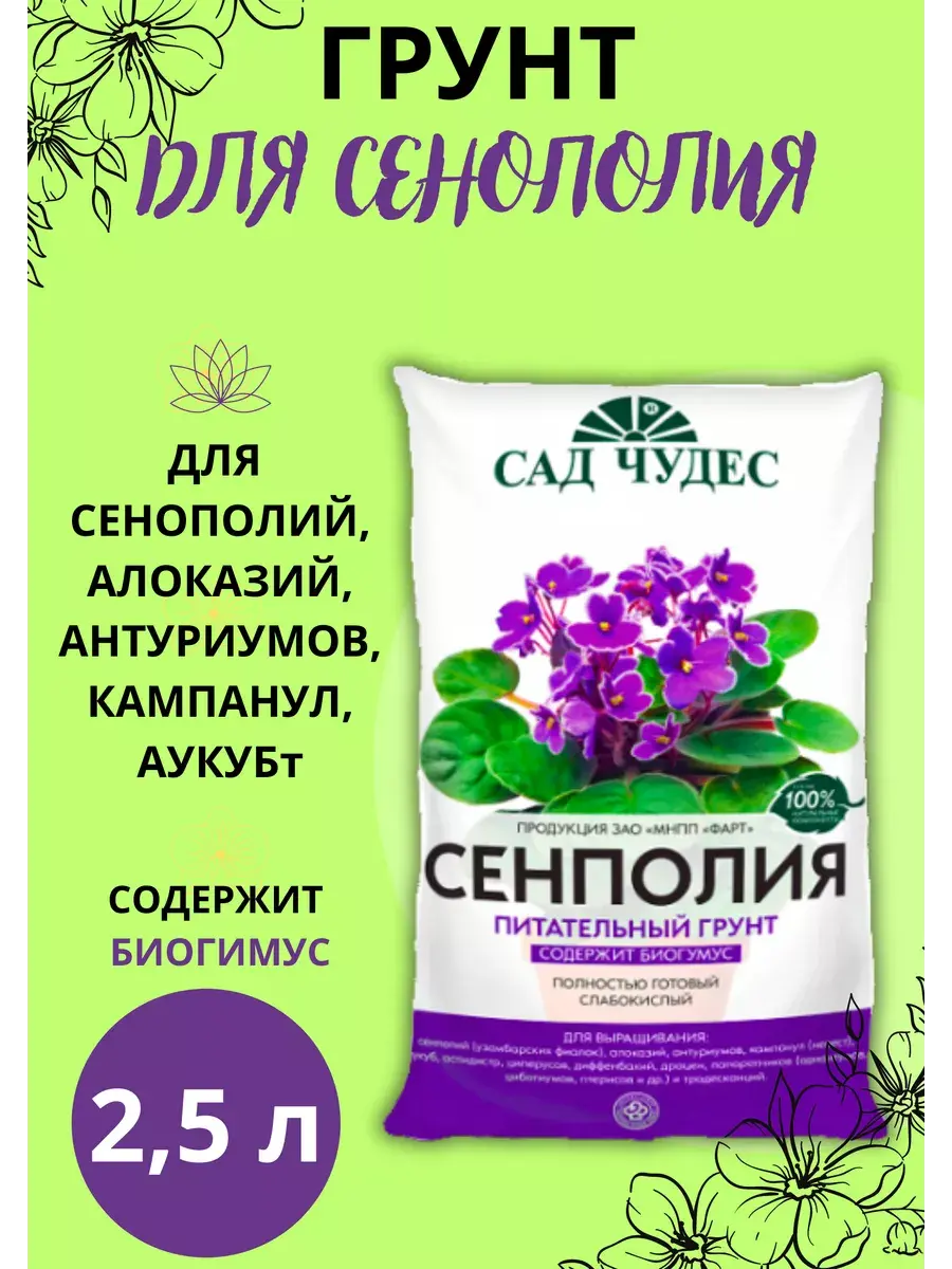Сенполия - cлабокислый питательный грунт, полностью готовый к применению для выращивания различных видов сенполий (узамбарских и африканских фиалок), алоказий, антуриумов, кампанул (невест), аукуб, аспидистр, циперусов, диффенбахий, драцен, папоротников (адиантумов, циботиумов, птерисов и др.), традесканций, а также ремонтантных гвоздик, гербер, гортензий красных, недотрог новогвинейских, хризантем.