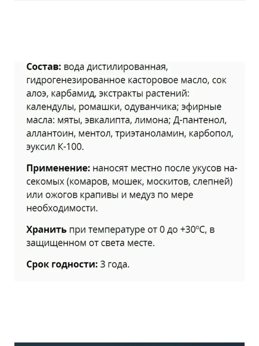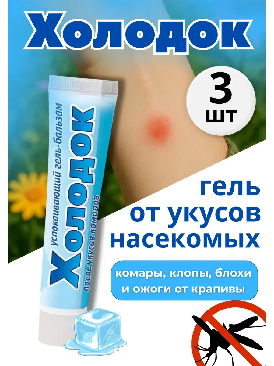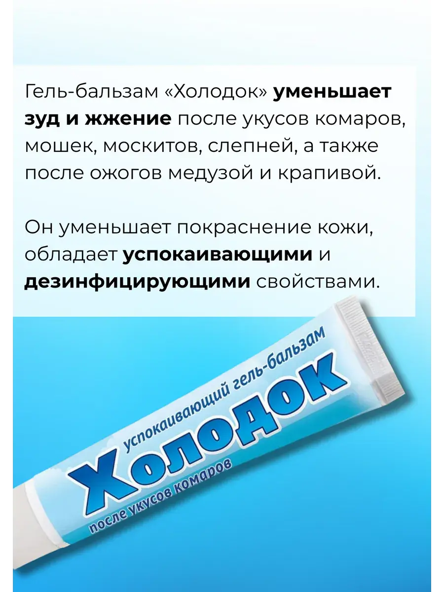 Гель после укуса "Холодок" 50мл это универсальное средство с успокаивающим эффектом, легко наносится на кожу, не имеет жирного блеска, оставляет на теле приятный аромат мяты и ощущение легкой прохлады. Крем-гель на водной основе обеспечивает быстрое охлаждение после нападения комаров клопов слепней москитов мошки а так же после ожогов от медуз и крапивы. Д-пантенол в составе бальзама имеет заживляющие свойства после солнечного воздействия и аллергических реакций уменьшает покраснения и снимает болевые ощущения. Защитный репеллент для восстановления эффективная мазь дезодорирующая и снимающая чес скорая помощь для любителей активного отдыха на природе в лесу пикнике и рыбалке. Так же ценная находка для садовода и. Крем-гель "Холодок" от российского производителя заменят вам дорогие аптечные препараты, удобный тюбик не занимает много места в сумочке, всегда можно брать с собой.