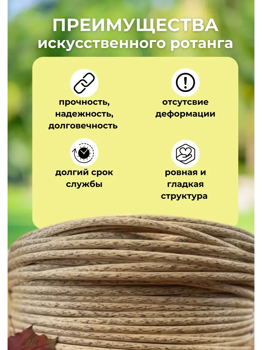 Искусственный ротанг для плетения — это современный материал, который идеально подходит для создания стильной и долговечной мебели. Полиротанг - это универсальный материал, который может использоваться для создания различных изделий. Он может стать незаменимым украшением вашего интерьера и сада. Прочный, долговечный и экологичный материал. Этот аксессуар для плетения прочный и долговечный, не выгорает на солнце, а также не подвержен воздействию влаги и перепаду температур, доступная цена, что делает его идеальным вариантом для использования на открытом воздухе. Этот материал легко чистится и не требует специального ухода, что делает его комфортным в использовании для любого интерьера. Благодаря использованию ротанга, изделия получают необходимую прочность и долговечность. Rammus экоротанг- это 100% экологически чистый полимерный материал нового поколения, который производится по уникальной формуле, разработанной технологами фабрики RAMMUS. В качестве компонентов для изготовления экоротанга применяется сугубо первичное сырье от мирового бренда Sabic - гранулированный полиэтилен высокого давления, полиэтилен низкого давления и линейный полиэтилен, а также краситель Masterbatch.